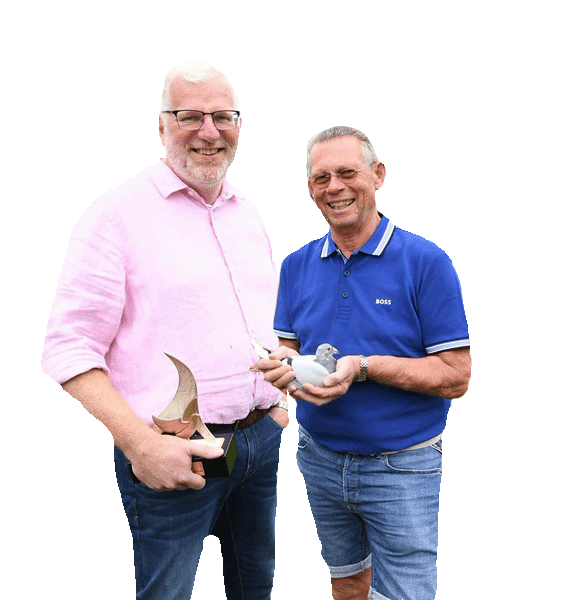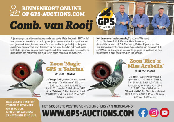 Comb. Van Rooij, selectie jonge duiven (2025) uit de allerbeste vliegers en kwekers Al jarenlang staat deze combinatie aan de top, vader Peter begon in 1987 actief met duiven en maakte er in de loop der jaren een echte familie sport van en een ijzersterk team, helaas kwam Peter op veel te jonge leeftijd onlangs te overlijden. Een enorme klap, hierdoor zal het voor hen dan ook nooit meer hetzelfde zijn, maar de gebroeders gesteund door hun moeder zullen alles op alles zetten om het niveau die zij al jaren halen minimaal te evenaren. Met duiven van tophokken als; Comb. van Wanrooij, Comb. Verbree, G. & S. Verkerk, Gebr. Leideman, Gerard Koopman, H. & E.J. Eijerkamp, Bakker Pigeons en Hok Jos Vercammen zit er een geweldige collectie aan duiven in Tull en ’t Waal. Nu brengen zij een aantal jonge in de verkoop uit hun topkwekers & Nat. Asduiven. Een top aanbod. Afdelings – nationale duifkampioenen 2023 2e Nat. Kampioen Midfond aangewezen WHZB/NPO 3e Afdeling Kampioen Vitesse Onaangewezen 2e Afdeling Kampioen Vitesse Aangewezen 1e Afdeling Kampioen Midfond Onaangewezen 1e Afdeling kampioen Midfond Aangewezen 1e Duifkampioen Midfond afd. 7 3e Duifkampioen Midfond afd. 7 4e Duifkampioen Vitesse afd. 7 5e Duifkampioen Midfond afd. 7 8e Duifkampioen Midfond afd. 7 9e Duifkampioen Midfond afd. 7 2e Duifkampioen Generaal Snelheid afd. 7 3e Duifkampioen Generaal Snelheid afd. 7 2e Duifkampioen Generaal Totaal afd. 7 5e Nat. Asduif Midfond WHZB/NPO 2022-8301008 10e Nat. Asduif Midfond De Allerbeste 2021-1025330 7e Nat. Asduif Vitesse/Midfond PIPA 2021-1025352 10e Nat. Asduif Midfond PIPA 2022-8301008 13e Nat. Asduif Vitesse/Midfond PIPA 2022-8301008 14e Nat. Asduif WBP Jaarling 2022-8301008 15e Nat. Asduif WBP Speed 2022-8301008 15e Nat. Asduif Snelheid De Allerbeste 2021-1025352 Afdelings – nationale duifkampioenen 2024 1e Afdeling kampioen Vitesse Onaangewezen 2e Afdeling kampioen Midfond Onaangewezen 2e Afdeling kampioen Natour Onaangewezen 8e Nat. Asduif Midfond WHZB-BOTB 5e Duifkampioen Midfond Afd. 7 5e Duifkampioen Natour Afd. 7 7e Duifkampioen Natour Afd. 7 10e Duifkampioen Natour Afd. 7 Afdelings – nationale duifkampioenen 2025 1e Afdeling kampioen Natour Onaangewezen 6e Afdeling kampioen Midfond Onaangewezen 4e Asduif Natour Afd. 7 9e Asduif Midfond Afd. 7 9e Asduif Natour Afd. 7 10e Asduif Generaal Snelheid Afd. 7 Afdelings – Zuid uitslagen 2023 Niergnies 8610 duiven 6-7-10-11-12 enz. 74/68 Niergnies 8143 duiven 1-2-14-25-42-68-76-80-82-115-124 enz. 54/48 Pontoise 6038 duiven 1-8-13-22-78-116-125-140 enz. 60/39 Niergnies 5958 duiven 9-10-13-15-20-23-40-42-45-78-83 enz. 40/37 Chateauroux Nationaal Sector 7541 duiven 13-50-105-161-171 enz. 21/11 Bierges 5238 duiven 1-2-3-6 t/m 13-15-16-17-18-35-45-46-48 enz. 93/83 + 4e S. Nat Issoudun tegen 7679 duiven Belangrijke uitslagen 2024 Pt.St.Maxence 2825 duiven 1-3-14-20-21-27-28-32-38-40-42 enz. 71/54 Pt.St.Maxence 2178 duiven 1-2-11-19-22-23-24-27-37-45 enz. 58/47 Melun 1326 duiven 2-9-11-12-34-36-37-50-51-54-55 enz. 58/42 Melun 1065 duiven 1-2-4-6-10-16-19-20-22 enz. 50/35 Niergnies 703 duiven 3-4-5-6-8-15-19-22-25 enz. 51/44 Niergnies 876 duiven 1-2-3-6-10-36 enz. 36/23 Bierges 1469 duiven 1-3-4-6-9-12-13-15-16-21-26-30-33-36 enz. 147/99 Entroeungt 1156 duiven 2-3-4-5-6-9-10-13-14-15-16-17-18-20-22-23-24-26 enz. 100/80 Morlincourt 820 duiven 1-2-3-4-5-6-11-12-15-16-18-19-20-23-24-26-27-28-29-30 enz. 87/66 Belangrijke uitslagen 2025 Morlincourt 2760 duiven 5-9-10-16-21-22-33-34-39-48 enz. 78/59 Pt.St.Maxence 2352 duiven 1-2-7-21-25-35-46-47-48-58 enz. 70/56 Melun 1167 duiven 2-7-13-15-16-17-18-21-33-34-36 enz. 65/37 Pt.St.Maxence 721 duiven 1-2-4-5-7-19-20-25-29-34-35-39 enz. 49/30 La Ferte St. Abuin 958 duiven 2-6-13-25-46-47 enz. 20/13 Salbris 645 duiven 1-2-4-6-20-52-55 enz. 14/13 Orleans 1301 duiven 4-23-30-34-84 enz. 18/13 Bierges 1751 duiven 1 t/m 9-12-13-14-15-16-17-20-21-22-23-24 enz. 112/81 Quievrain 1356 duiven 4-6-13-14-16-17-19-21-24-25-26-27-28-29-30-31-32-34-38-40 enz. 85/78 Quievrain 1334 duiven 2-3-4-5-6-7-8-10-11-14-16-17-18-20-22-29-30-32-33-34-35-36-37 enz. 108/86 Etroeungt 953 duiven 1-5-6-7-8-10-12-13-14-15-18-20-21-23-24-25-26-28 enz. 97/74 Morlincourt 722 duiven 1-2-3-4-5-7-9-10-11-12-13-16-18-20-21-22-24-25-26-27-28-29-31 enz. 97/74