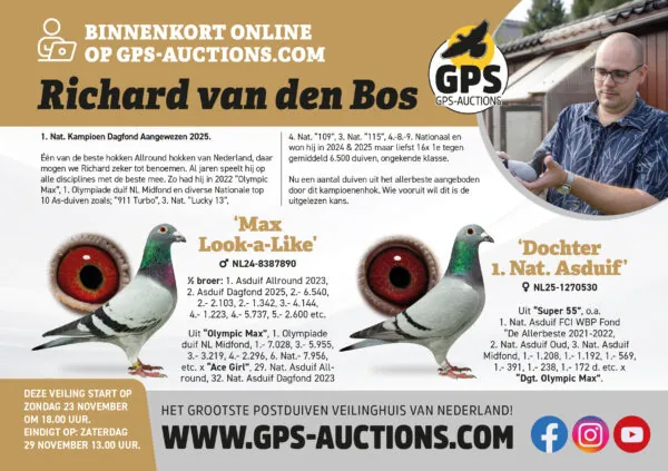 Richard v/d Bos, 1e Nationaal Kampioen Dagfond Aangewezen 2025 Een hok dat tot de absolute top van Nederland behoort! Als we spreken over de meest complete allround hokken van Nederland, dan mógen we Richard v/d Bos zonder twijfel tot de allerbeste rekenen. Jaar in jaar uit bewijst hij zijn ongekende klasse op álle disciplines. Van Vitesse tot en met de Marathon, overal draait hij mee aan de top. Richard had enkele jaren terug ook zijn “Olympic Max”, 1e Olympiade Duif NL Midfond. Dat was zeker niet de laatste Nationale asduif: “Olympic Max” – 1e Olympiade Cat. Midfond “Super 55” – 1e Nationale Asduif “911 Turbo” – 3e Nationaal “Lucky 13” – 4e Nationaal “De 109” – 3e Nationaal “De 115” – 4e, 8e, 9e Nationaal En dan die ongekende reeks van de afgelopen seizoenen: In 2024 én 2025 won Richard maar liefst 16x een 1e prijs tegen gemiddeld 6.500 duiven! Highlights 2025: 1e Nationaal NPO Kampioen Dagfond Aangewezen 1e-2e-7e-21e-24e-30e-32e-33e-43e-85e S-Prov. Quievrain 6.035d. 1e-3e-25e-29e-69e-86e-105e NPO Lamotte-Beuvron 4.381d. 1e-5e-52e-55e-72e-75e-82e-90e S-Prov. Arras-Grevillers 3.836d. 1e-24e-37e-47e S-Prov. St. Soupplets 2.768d. 1e-7e-9e-28e-46e-51e-52e-53e-55e ZHE Lennik 2.653d. 1e-5e-6e-15e-16e-18e-21e-31e-32e-35e-51e-61e-69e-71e-86e-87e S-Prov. Pt.St.Maxcence 2.600d. 1e-3e-4e-7e-8e-9e-19e-28e-43e-55e ZHE Morlincourt 1.950d. 1e-2e-6e-8e-9e-11e-17e-35e-50e-69e-70e-75e-87e S-Prov. Orleans 1.257d. 2e-3e-90e-112e S.Prov. Arras-Grevillers 5.648d. 2e-4e-5e-6e-7e-8e-9e-11e-14e-16e-17e-18e-20e-21e ZHE Duffel 2.521d. 3e-10e-14e-16e-21e-33e-75e S-Prov. Vitry-en-Artois 5.412d. 3e-7e-10e-16e-17e-36e-63e-93e-101e S-Prov. Pt.St.Maxcence 4.144d. 4e-6e-29e-41e-54e NPO Issoudun 4.100d. 4e-11e-12e-27e-28e-32e-49e-50e S-Prov. Chateauroux 1.647d. 5e-25e-26e-41e-42e-43e S-Prov. Issoudun 1.598d. 18x 1e Prijs Pv.de Combinatie Middelharnis (43 hokken) 10x 1e Prijs Samenspel Zuid Hollandse Eilanden (gem. 1.342d.) 6x 1e Prijs Semi Prov. Afd. 5 West (gem. 2.969d.) Zonder dubbelingen! Dagfond 2025: 214 mee / 159 prijzen = 74.3% prijspercentage Kampioenschappen/Asduiven 1e Keizer Generaal Kampioen 2024 Samenspel Zuid Hollandse Eilanden 1e Kampioen Dagfond, Oud, Jong, Natour, Generaal Onaangewezen Sam. ZHE 1e Kampioen Dagfond, Oud, Natour, Generaal Aangewezen Samenspel ZHE 1e-2e-3e-4e-5e-6e-7e-8e-10e Asduif Dagfond Samenspel ZHE 1e-2e-3e-4e-5e-8e-9e-10e Asduif Oud Samenspel ZHE 1e-2e-3e-4e-5e-6e-7e-8e Asduif Generaal Sampenspel ZHE 1e-10e Asduif Midfond Sampenspel ZHE 1e-2e-4e-7e Asduif Natour Samenspel ZHE O. 2025 Nat. Asduiven 18e Nat. Asduif Allround De Allerbeste “Miss Red Diamond” 20e Olympiade duif Cat. Allround “Miss Red Diamond” 20e Olympiade duif Cat. Jonge duiven “042” 23e Nat. Asduif FCI World Best Pigeons Jonge duiven “042” 24e Nat. Asduif Dagfond NPO/WHZB “Miss Red Diamond” 27e Nat. Asduif Dagfond NPO/WHZB “Son Olympic Max” Provinciale Overwinningen 1e Provinciaal NPO Lamotte-Beuvron 4.381d. 2025 “Sunshine” 1e Provinciaal Niergnies 10.226d. 2024 “Miss Red Diamond” 1e Provinciaal Niergnies 15.207d. 2023 “Felle 52” 1e Provinciaal Niergnies 19.422d. 2022 “Femke” 1e Provinciaal Quievrain 10.070d. 2022 “222” 1e Provinciaal Niergnies 13.185d. 2021 “Turbo 43” Nu biedt Richard een select aantal jonge duiven (2025) aan uit zijn allerbeste lijnen, pak uw kans!