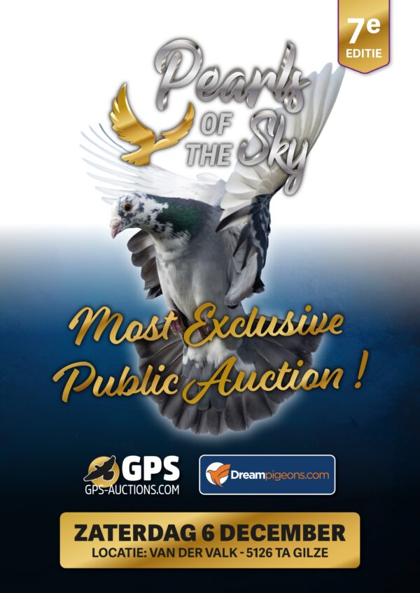 PEARLS OF THE SKY - 7E EDITIE – 6 DECEMBER 2025 87 exclusieve duiven aangeboden van en door kampioenen uit Nederland & België. Geachte Sportvrienden & Vriendinnen, Het wordt alweer de 7e editie van dit geweldige evenement. Een internet-/zaalveiling waar alleen de internationale top aan meedoet en die inmiddels is uitgegroeid tot een vaste waarde binnen de hedendaagse duivensport. Dit jaar is er een nieuwe samenwerking aangegaan met Dreampigeons.com (Bart Hoogeveen). Die zich focust op de Chinese markt. Ze hebben een zeer breed netwerk met diverse agenten. Mede hierdoor kunnen wij onze duiven beter presenteren en onder de aandacht brengen van een nog breder publiek. Onze hoofdagent voor de Chinese markt is Mrs. Snow. Ze heeft al onze deelnemers bezocht en er mooie interviews en promofilms gemaakt om ook zo het aanbod wereldwijd onder de aandacht te brengen. Wij zijn haar dan ook zeer erkentelijk voor haar werkzaamheden en hopen dat mede door haar inzet de kwaliteit die wij hier in deze veiling aanbieden zal worden gewaardeerd. Dit jaar is de nadruk meer komen te liggen op de programma duiven, maar we hebben ook enkele exclusieve duiven voor de fond liefhebbers onder ons in de verkoop. Bijna alle Nederlandse topliefhebbers doen weer mee en hebben extra hun best gedaan om iets specials te brengen. Daarnaast zijn we erin geslaagd om dit jaar ook de Belgische markt, ook wel het mekka van de duivensport genoemd er meer in te betrekken met ook daar een absoluut topaanbod. Dit alles bij elkaar heeft er voor gezorgd dat de kwaliteit die wij aanbieden nog nooit zo hoog is geweest. In deze veiling worden enkel kinderen, broers, zussen of nauw verwanten nazaten aangeboden van Nationale winnaars, Nationale as-duiven of Olympiade duiven. Door deze unieke samenwerking hopen wij als organisaties verder te kunnen groeien en dat dit event meer een meer een begrip wordt. Wij danken op voorhand onze deelnemers voor het vertrouwen en natuurlijk ook onze kopers, die we alvast veel succes wensen met de nieuwe aankopen, want zonder u geen Pearls Of The Sky. We wensen u veel plezier en succes tijdens de “Pearls Of The Sky”. Team GPS-Auctions & Dreampigeons.