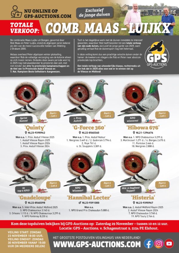 TOTALE VERKOOP COMB. MAAS-LUIJKX -- (Exclusief de jonge duiven 2025) De combinatie Maas-Luijkx uit Dongen, gevormd door Rob Maas en Peter Luijkx, stond de afgelopen jaren bekend als één van de meest succesvolle hokken van Afdeling 2 Brabant 2000. Helaas overleed Peter afgelopen winter plotseling, waardoor Rob de volledige verzorging van de kolonie alleen op zich moest nemen. Ondanks deze zware periode wist hij in 2025 nog indrukwekkender te presteren dan ooit, met niet minder dan drie 1e provinciale kampioenschappen en de titel van 1e Provinciale Asduif Vitesse. Toch is het dagelijkse werk met de duiven inmiddels te intensief geworden, waardoor Rob heeft besloten tot een totale verkoop van zijn oude duiven, exclusief de jonge garde van 2025, want gelukkig verlaat Rob de duivensport nog niet helemaal. In deze veiling komt dus een prachtige selectie duiven onder de hamer: de kwekers en vliegers die Rob en Peter naar absolute provinciale top brachten. Belangrijkste prestaties 2025: 1. Provinciaal Kampioen Midfond Onaangewezen 1. Provinciaal Kampioen Midfond Aangewezen 1. Provinciaal Kampioen Vitesse Aangewezen 1. Provinciale Asduif Vitesse met “Quinty” 2. Provinciaal Kampioen Jonge Duiven Aangewezen 2. Provinciaal Kampioen Vitesse Onaangewezen 6. Provinciaal Kampioen Jonge Duiven Onaangewezen 7. Nat. Kampioen Beste Liefhebbers Aangewezen 8. Nat. Kampioen Vitesse Aangewezen 12. Nat. Kampioen Beste Liefhebbers Onaangewezen 20. Nat. Kampioen Jonge Duiven Onaangewezen 23. Nat. Kampioen Vitesse Onaangewezen 28. Nat. Kampioen Jonge Duiven Aangewezen 32. Nat. Kampioen Midfond Aangewezen Een totale verkoop van uitzonderlijke klasse, rechtstreeks uit een hok dat in 2025 alles won wat er te winnen viel op de Vitesse en Midfond!