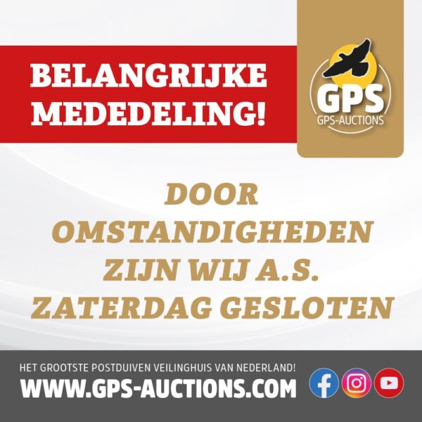The Speed Auction In The Speed Auction brengen wij een uitgesproken selectie snelheidsduiven van absolute topklasse, opgebouwd rond nationale asduiven, Olympiadelijnen en bewezen prestatiefamilies. Deze veiling is speciaal samengesteld voor liefhebbers die streven naar pure snelheid en directe resultaten. Met originele duiven en rechtstreekse afstammelingen van onder andere B. & L. Geerinckx, Best Kittel (PIPA Breeding), Leo Heremans-lijnen via Göbel–van der Sluis, Eddy Janssens, Gebr. v/d Heuvel en Johnny Panis, bevat deze collectie alles wat moderne snelheidssport vereist. Een unieke kans om uw kolonie te versterken met pure snelheid, nu exclusief aangeboden via GPS Auctions.极速拍卖会 在极速拍卖会上,我们精选了绝对顶尖的短距离血统鸽子,这些鸽子均源自国家冠军鸽、奥林匹克血统及久经考验的家族。本次拍卖会专为追求纯粹速度的鸽友们准备的。 拍卖包括以下鸽友的原舍和一些铭鸽的后代:吉林克斯父子,最佳基特尔血统(PIPA育种),里奥.赫尔曼斯血统(戈培尔-范德斯劳特),艾迪.詹森,范德海弗尔兄弟和强尼.巴尼斯。 请鸽友们关注此次拍卖!
