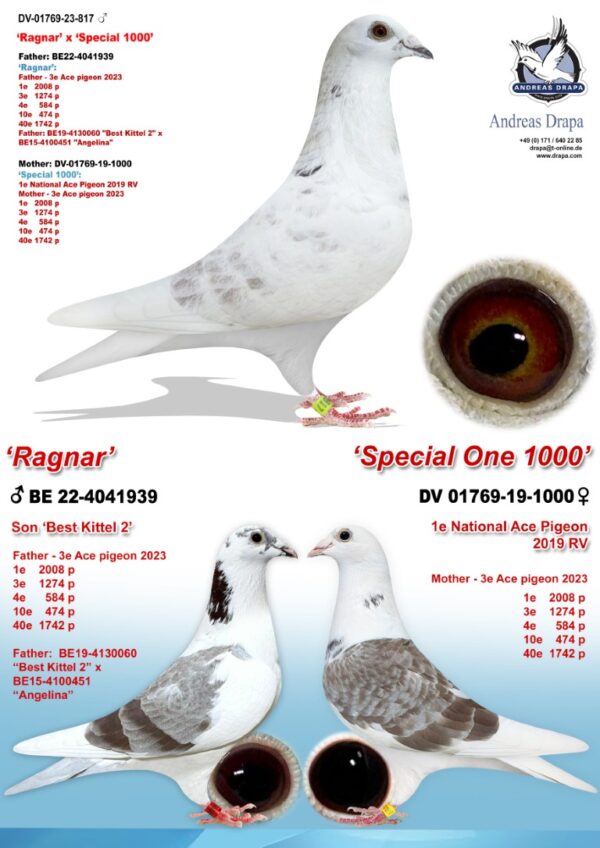 Andreas Drapa, een groot kampioen en wereldwijd bekend binnen de duivensport. Jaarlijks brengt hij meerdere duiven in de verkoop via GPS en ook nu komt hij met een aantal jonge uit zijn “gouden kweekbestand”. Zo vinden we in deze veiling een kind van de unieke duif ''Maverick'', 1. Olympiade duif & 1. Int. Asduif Jaarlingen, een uniek talent & misschien wel de beste ter wereld! Daarnaast ook uit kinderen van deze wereldberoemde stammen: ''Best Kittel'', ''Porsche 911'', ''Kittel'', ''Méchant Best Kittel'', etc. Wie voor kwaliteit gaat, moet zeker deze veiling bekijken !!!!!!!!!!! 安德烈.德拉帕,一位伟大的冠军,在赛鸽运动中享誉全球。 每年他都会通过 GPS 出售几羽鸽子,此次拍卖他还带着几羽来自他的“黄金种鸽”的幼鸽。 拍卖包括鸽舍现在最著名的新星“马弗瑞克” 的一羽子代。 拍卖还包括以下著名鸽子的后代,例如;“保时捷 911”, KBDB 中长距离全国鸽王5位,还有 “最佳基特尔”, 2016 & 2017 年全国短距离鸽王冠军和4位,“基特尔”和“坏小子最佳基特尔”等等。 请鸽友们关注此次拍卖!