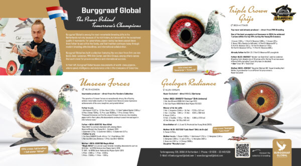Burggraaf Global – De Ultieme Mix Veiling voor de Serieuze Duivensportliefhebber Dit is geen gewone verkoop. Dit is een zeldzame mogelijkheid om te investeren in bewezen topkwaliteit, een elitecollectie van slechts tien uitzonderlijke duiven, rechtstreeks uit de prestigieuze kweeklijnen van Burggraaf Global. Waarom deze veiling een buitenkans is: Genetische perfectie Alle aangeboden duiven zijn zorgvuldig geselecteerd op basis van prestaties en afstamming. Ze zijn afkomstig uit absolute topbloedlijnen, met een focus op afstanden van 100 tot 500 km. De kern van deze selectie bestaat uit nakomelingen van Unseen Forces, een superieure inteeltcombinatie van New Kittel (volle broer van Kittel) en Magic Kittel (volle zuster van Kittel). Topafstamming van wereldberoemde kampioenen De duiven zijn verwant aan grootheden zoals ‘Harry’, ‘Olympiade 003’, ‘Ché’, ‘Olympic Rosita’ en ‘Porsche 911’. Dit biedt een unieke kans om uw kolonie te versterken met bloedlijnen die al internationaal bewezen hebben tot de allerbeste te behoren. Focus op prestaties: Unseen Forces De impact van Unseen Forces op de duivensport is indrukwekkend. Zijn nazaten presteren keer op keer op het hoogste niveau: • 1e Morlincourt tegen 10.627 duiven – kind Unseen Forces • 3e Provinciaal Roye tegen 2.379 duiven – kind Unseen Forces • 3e Final Thailand Master tegen 2.305 duiven – kleinkind van Unseen Forces • 5e Provinciaal Laon tegen 10.564 duiven – kind van Unseen Forces • 14e Provinciaal Melun Andrezel tegen 8.013 duiven – kleinkind van Unseen Forces