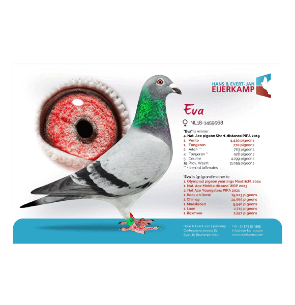 Belgium Speed Pigeons - Eva Special Cornelis “J” Krijnen, de man achter Belgium Speed Pigeons, staat bekend om zijn sterke kweekhok, opgebouwd uit het allerbeste van Nederland en België. De basis ligt bij de toplijnen van Gebr. Leideman, met onder andere “Goed Grijs”, “Crack 19” en natuurlijk “Eva”, één van de meest invloedrijke duiven binnen deze kolonie. Aangevuld met investeringen bij o.a. G. & S. Verkerk, Hans & Evert Jan Eijerkamp, Jan Hooymans en J. & F. Hendriks, is hier een stam opgebouwd waarin kwaliteit en prestaties centraal staan. In deze veiling draait alles om “Eva”, een uitzonderlijke duif die zich zowel als vlieger én als kweker heeft bewezen: 1e Semi-Prov. Asduif Sprint 4e Nat. Asduif Sprint NPO Haar nakomelingen winnen o.a.: 1e Olympiade duif Cat. Jaarlingen 1e Nat. Asduif Midfond PIPA-Rankings 1e Nat. Asduif Allround FCI 1e Nat. Asduif Midfond FCI En talrijke 1e prijzen: 1e Beek en Donk – 15.023 duiven 1e Chimay – 14.065 duiven 1e Niergnies – 10.981 duiven 1e Moeskroen – 5.548 duiven 1e Etrœungt – 5.066 duiven 1e Rethel – 4.252 duiven 1e Laon – 2.715 duiven 1e Arlon – 2.374 duiven 1e Weert – 2.216 duiven 1e Boxmeer – 2.197 duiven 1e Heusden – 2.115 duiven 1e Châlons – 2.069 duiven 1e Arlon – 1.764 duiven 1e Blankenheim – 1.698 duiven “Eva” is daarmee niet alleen een topvlieger, maar vooral een absolute stempelduif in de kweek, en bovendien een directe dochter van “Goed Grijs”. Een veiling die volledig in het teken staat van één van de sterkste lijnen van dit moment, met prestaties die voor zich spreken.比利时速度鸽舍 – “艾娃”专场 康纳利斯.克莱能是组合“比利时速度中心”的主人,他本身是荷兰的一位顶级鸽友,在比利时创办了一家育种中心。 他拥有荷兰强豪雷德曼兄弟最好的血统,包括“好花”,“好手19号”和“艾娃”的后代。 此外,他还引进了佛科克,杨.胡曼斯,爱亚卡普的优秀种鸽。 此次拍卖的鸽子大部分出自 “艾娃”, 它既是一羽超级赛鸽,也是一羽超级种鸽,它本身获得: 半省速度鸽王冠军 NPO全国速度鸽王4位 作出后代获得: 奥林匹克一岁鸽王冠军 PIPA-排行全国中距离鸽王冠军 FCI全国全能鸽王冠军 FCI全国中距离鸽王冠军 还包括很多赛绩: 1位 比克恩-唐克– 15.023 羽 1位 奇梅– 14.065 羽 1位尼尔尼斯– 10.981 羽 1位莫斯克伦– 5.548 羽 1位 埃特罗昂 – 5.066 羽 1位 雷特尔 – 4.252 羽 1位 劳恩– 2.715 羽 1位 阿尔隆– 2.374 羽 1位 韦尔特 – 2.216 羽 1位 博克斯梅尔 – 2.197 羽 1位 赫斯登 – 2.115 羽 1位 沙龙– 2.069 羽 1位 阿尔隆 – 1.764 羽 1位 布兰肯海姆– 1.698 羽 因此,“伊娃”不仅是一只顶尖赛鸽,更是一只在育种方面具有绝对影响力的种鸽,而且还是“好花”的女儿。 请鸽友们关注此次拍卖!