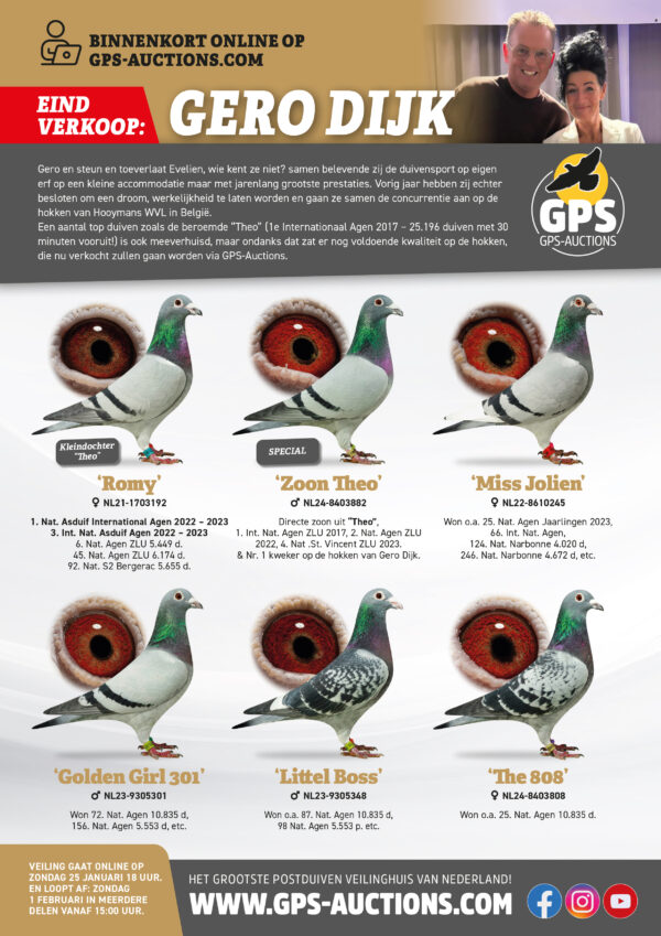 Endgültiger Verkauf aller verbleibenden Tauben Gero Dijk Gero und Unterstützung und Vertrauensperson EvelienWer kennt sie nicht? Gemeinsam betrieben sie auf ihrem eigenen Bauernhof in einer kleinen Anlage Taubenrennen, erzielten aber über Jahre hinweg großartige Erfolge. Letztes Jahr beschlossen sie jedoch, sich einen Traum zu erfüllen und gemeinsam in den Taubenschlägen von Jan Hooymans WVL in Belgien. Eine Reihe von Spitzentauben, wie der berühmte „Theo“ (1. Internationaler Agen 2017 – 25.196 Tauben mit 30 Minuten Vorsprung!), sind ebenfalls mit uns umgezogen. Trotzdem befand sich noch genügend Qualität in den Taubenschlägen, die nun über [Link einfügen] verkauft werden. GPS-Auctions. Erbe eines Phänomens NL14-1049775 „Theo“ 1. Internationaler Flug Agen 2017 – 25.196 Tauben (mit 30 Minuten Vorsprung!) Viele Spitzentauben sind entweder hervorragende Rennflieger oder wertvolle Zuchttauben. Nur die absoluten Ausnahmen vereinen beide Qualitäten. „Theo“ gehört zweifellos zu dieser erlesenen Gruppe. Seine Nachkommen liefern Jahr für Jahr absolute Weltklasseleistungen. Hier eine Auswahl der Erfolge seiner Kinder und Enkel: • 1. Nationaler As-Taube KBDB Großmittelstrecke Jungtauben 2022 • 1. Nationaler As-Taube Agen 2022/2023 • 1. Nationaler As-Taube Jungtauben Allround Rumänien 2024 • 1. Nationaler As-Taube Jungtauben Mittelstrecke Rumänien 2024 • 1. Preis gegen 29.000 Tauben in Rumänien • 2. National Agen ZLU 12.913 Tauben • 3. Internationaler As-Taube Agen 2022/2023 • 4. Extra-Finale Internationales Taubenrennen Pattaya 2025 4.878 Tauben • 4. National St. Vincent ZLU 2.532 Tauben • 8. National Argenton KBDB 16.496 Tauben • 8. National Argenton KBDB 13.393 Tauben • 10. National Agen ZLU 6.174 Tauben • 12. National Agen ZLU 6.174 Tauben Gero Dijks Erfolge 2025: Pau 1022 km 3503 Tauben: 56. National Agen 972 km 10835 Tauben: 10. Nat, 24. Nat, 72. Nat, 77. Nat, 106. Nat, 108. Nat, 147. Nat, 415. Nat Barcelona 1160 km 4515 Tauben: 143. National, 389. National Dax 1005 km 2230 Tauben: 23. National, 105. National Marseille 956 km 2347 Tauben: 87. National, 11. National Narbonne 967 km 4020 Tauben: 124. National Erfolge bei den One Loft Races 2025: • 2. Platz im Finale 517 km Mailand Beste Tauben Italiens • 2. As-Taube Mailand Beste Tauben Italiens Meisterschaften 2025: • 17. Nationaler Meister (nicht nominiert) Marathon-Morgenauflass • 16. Nationaler Meister (nominiert) Marathon-Morgenauflass • 24. Nationaler As-Taube Marathon-Morgenauflass • 3. Keizer-Meister (Morgenauflass) Marathon Vliegers Hendrik ido Ambacht • 8. Keizer-Meister (SNZH) Morgenauflass Referenzen 2025 Gero Dijk Tauben: Janssen-Weijers: • 10. NPO Agen 479 Tauben • 22. NPO Marseille 139 Tauben • 28. NPO Periqueux 1007 Tauben • 39. NPO Periqueux 1503 Tauben Jeroen und Stijn Rans: • 5. Nat Perpignan 3522 Tauben • 245. Nat Perpignan 4850 Tauben • 25. Nat Marseille Marian Tampau: • 1. Nationalflug Sterdyn 595 km 29.000 Tauben Jelle Roziers Itegem: • 2. Prov Vierzon 804 Tauben • 134. Nat Bourges 21502 Tauben Brent Lemmens Herenthout: • 1. Montargis 1617 Tauben • 1. Montargis 1397 Tauben • 1. Quievrain 557 Tauben • 2. Montargis 4938 Tauben • 48. Quievrain 1154 Tauben Noch mehr Verweise..... • 2. Nat Melun • 9. Nat Issoudun • 9. Nat Vierzon • 10. FCI Final Pattaya Int OLR 430 km • 26. Final Race Alshaheed OLR 525 km • 32. Nat Argenton 525 km 15322 Tauben • 87. Nat Bourges 11952 Tauben • 91. NPO Fontenay 7000 Tauben
