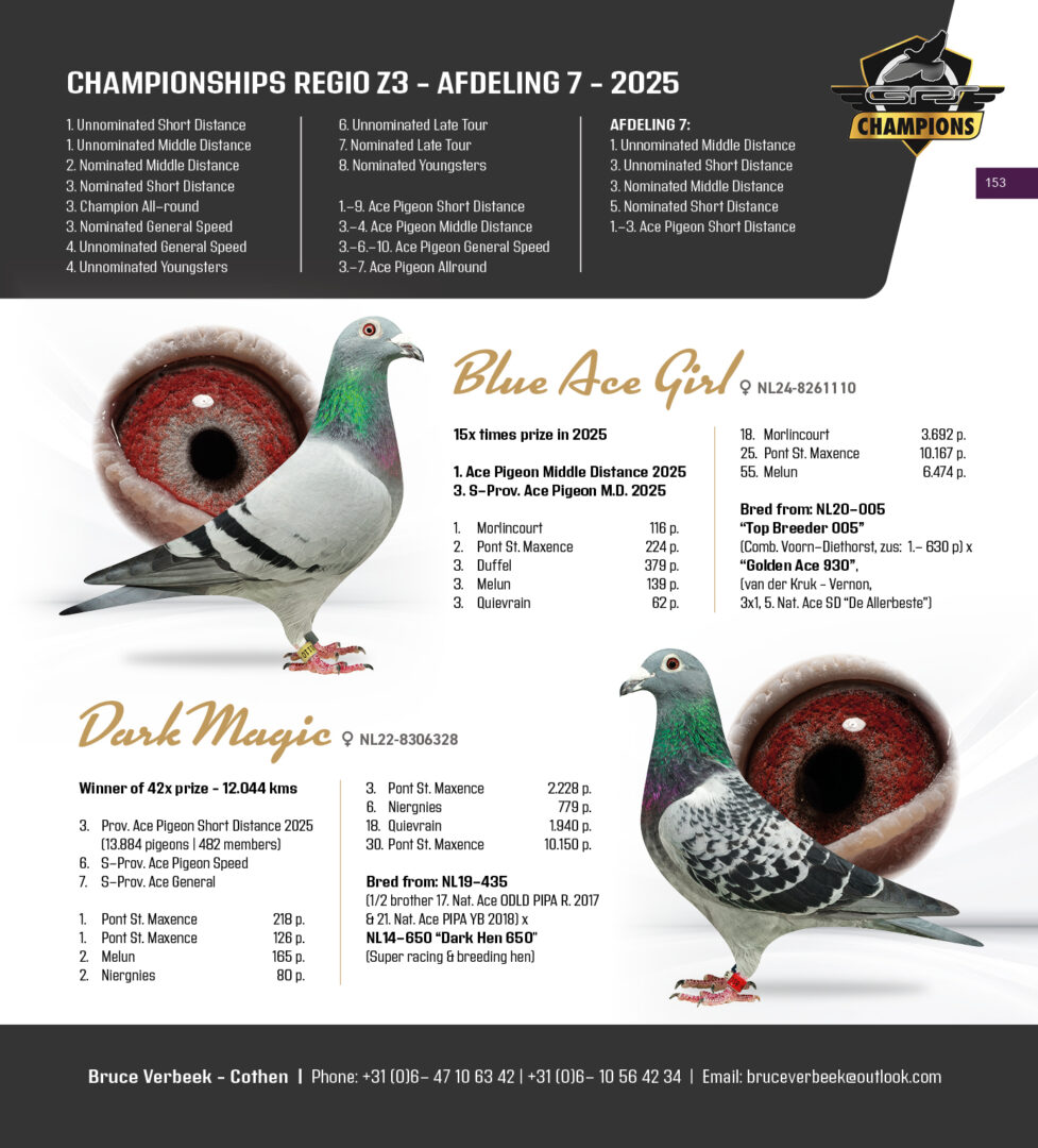 Uit: ”Son 3. PIPA Ace”, zoon ”De 624”, 3. Nat. Asduif Vitesse PIPA-Rankings x ”Beyonce”, 1. Prov. Asduif Vitesse, 2.-7.-9. S-Prov. Asduif, 1.-1.004 d., 2.-937 d., 11.-658 d., 15.-2.356 d., 26.-4.015 d., 36.-631 d., 41.-1.469 d.