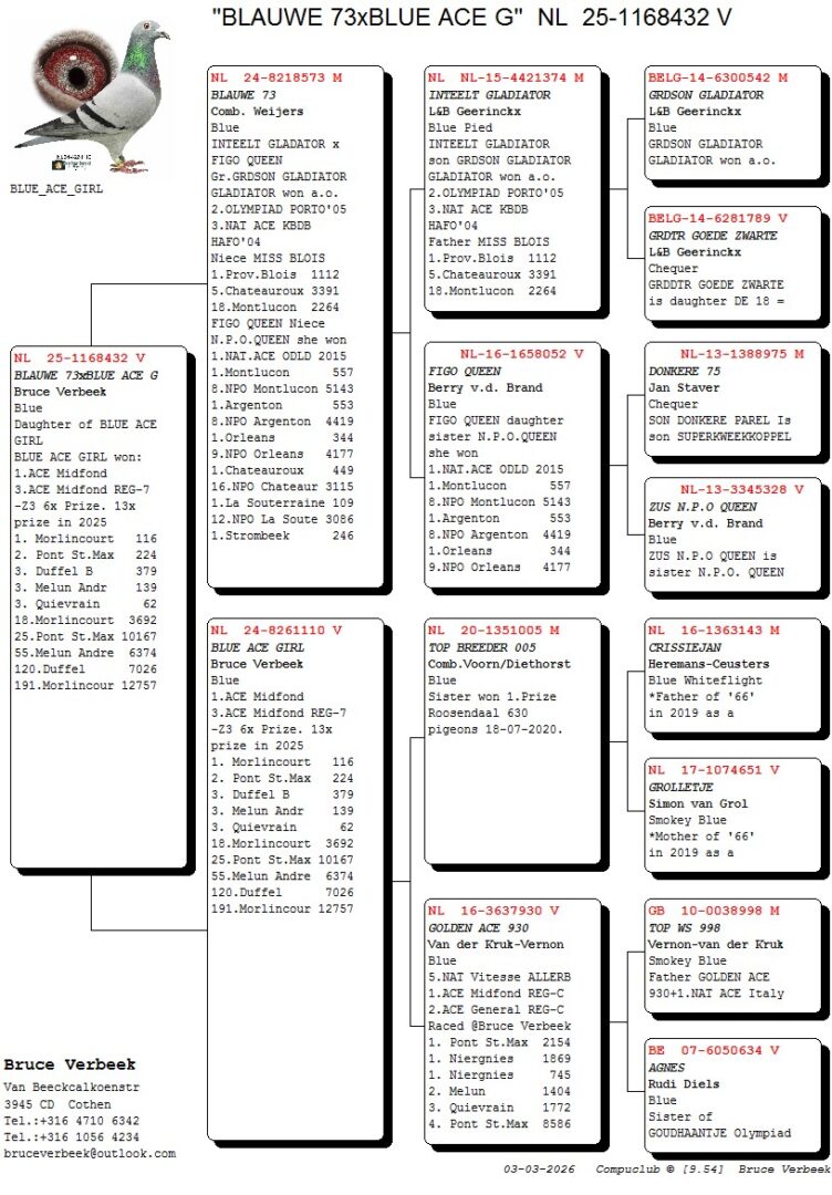 Uit: ”Blauwe 73”, inteelt ”Gladiator”, Bart Geerinckx, 2. Olympiade duif, 3. Nat. Asduif KBDB x ”Blue Ace Girl”, 1. Asduif Midfond, 3. S-Prov. Asduif Midfond, 1.-116 d., 2.-224 d., 3.-379 d., 3.-139 d., 18.-3.692 d., 25.-10.167 d.