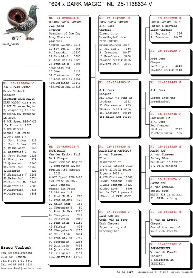 Uit: ”Grdtr. Super Dagfond”, J.A. Goes x ”Dark Magic”, 3. Regionaal Asduif Vitesse, 6. S-Prov. Asduif Vitesse, 7. Asduif Allround, 1.-218 d., 1.-126 d., 2.-80 d., 3.-2.228 d., 6.-779 d., 18.-1.940 d., 30.-10.150 d., 57.-1.285 d.