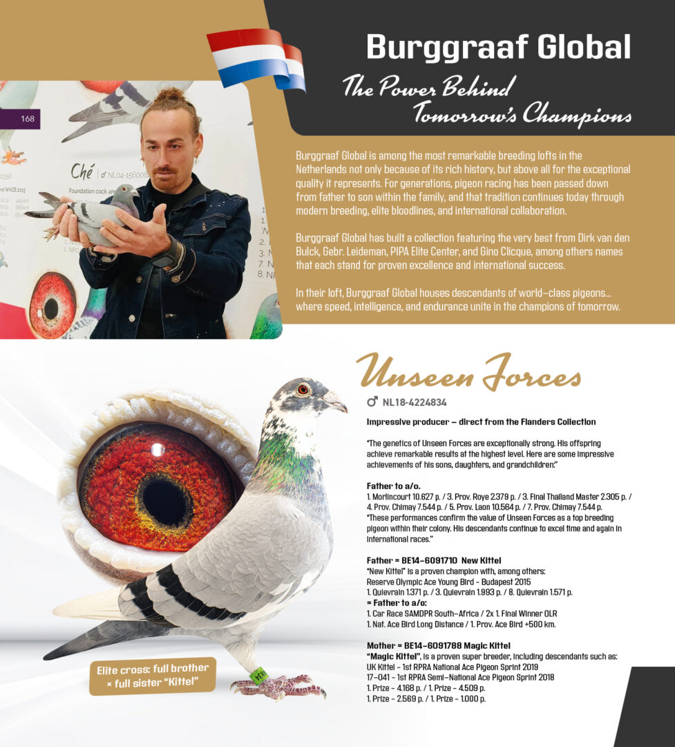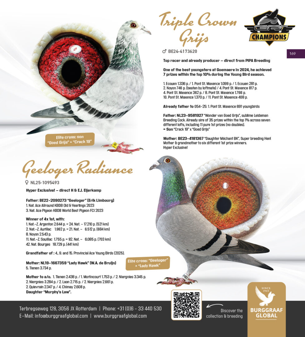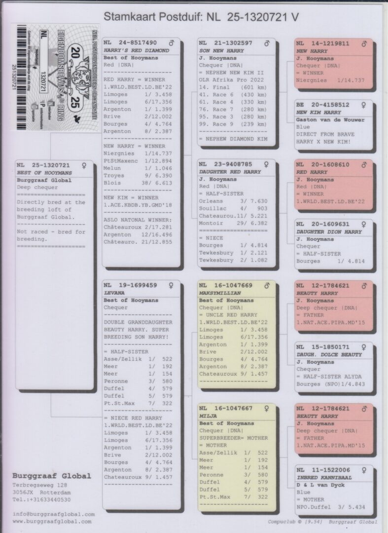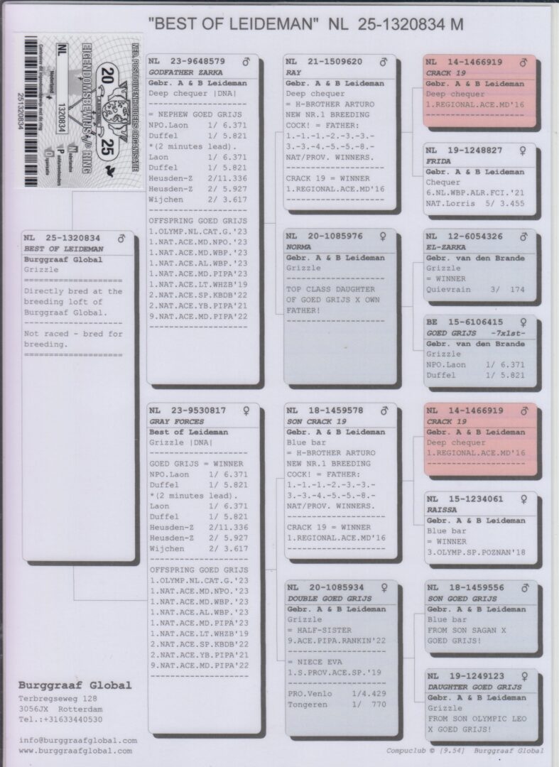Uit: ”Godfather Zarka”, uit zoon ”Crack 19”, uit 1/2 zus & dochter ”Goed Grijs”, 7x 1. Prijs & 1. NPO Laon 6.371 d., nazaten 7x 1. Nat. Asduif x ”Gray Forces”, uit dochter ”Son Goed Grijs 998”, uit dubbele kld. ”Goed Grijs”