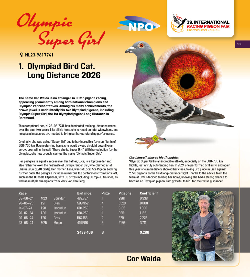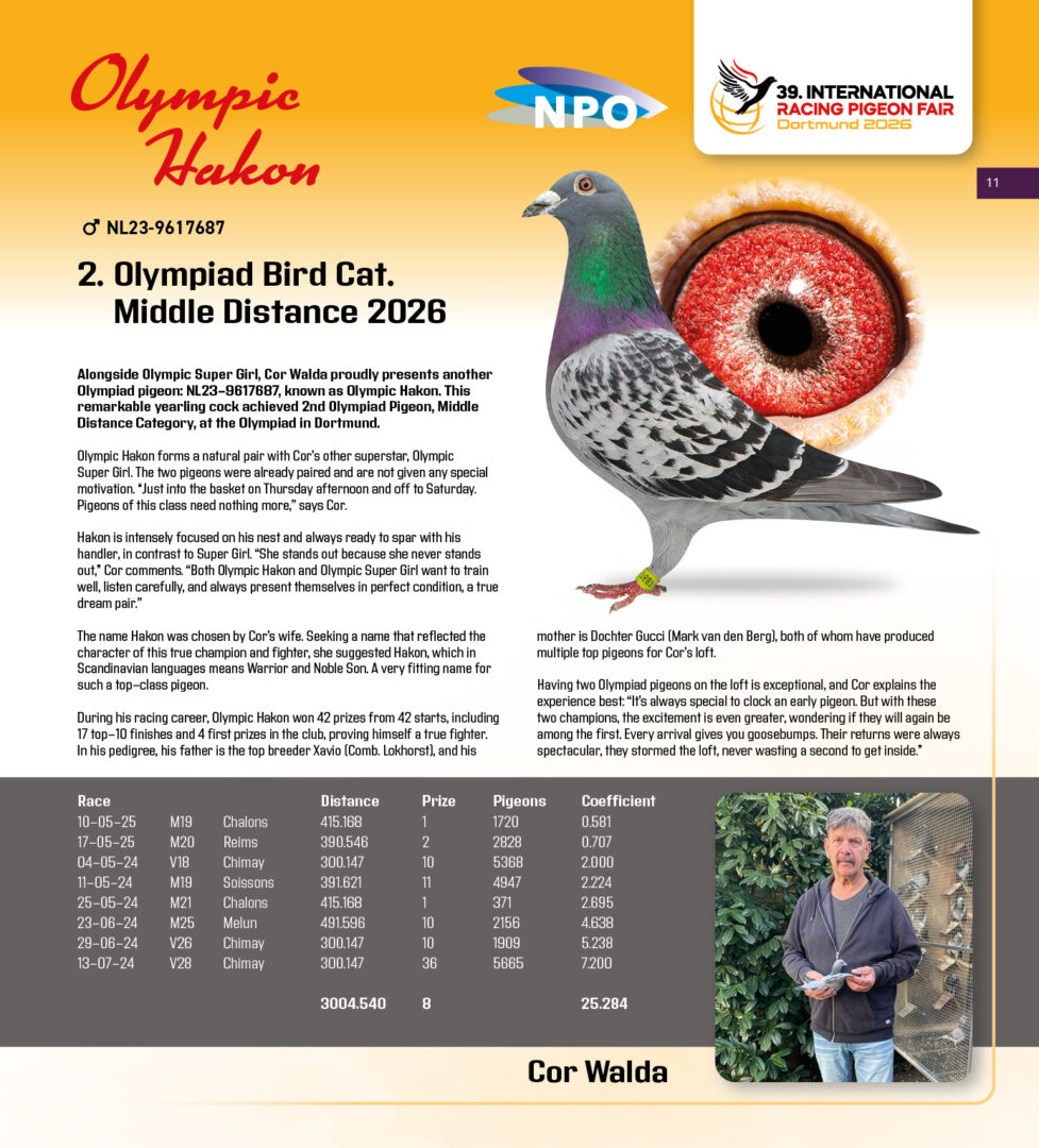 (1/2) zus ”Olympic Hakon”, 2. Olympiade duif Cat. Midfond 2026, 1/2 zus kweker ”Olympic Super Girl”, 1. Int. Olympiade duif Cat. Dagfond 2026, uit: ”Marquez x Rita”, gr-vader 1. NPO Issoudun 1.826 d. x ”Dochter Gucci”