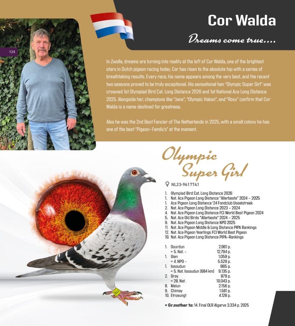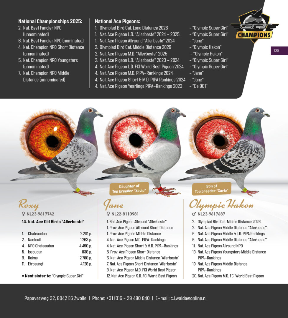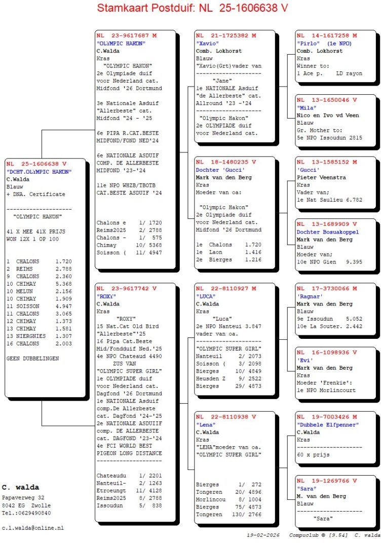Uit: ”Olympic Hakon”, 2. Olympiade duif Cat. Midfond 2026, 3.-6.-6.-11. Nat. Asduif, 1.-1.720 d., 2.-2.788 d., 9.-2.360 d., 10.-5.368 d., 10.-2.156 d., 10.-1.909 d., 11.-4.947 d. x ”Roxy”, 1.-2.201 d., 2.-1.263 d., 15.-16. Nat. Asduif