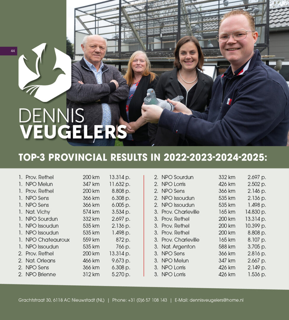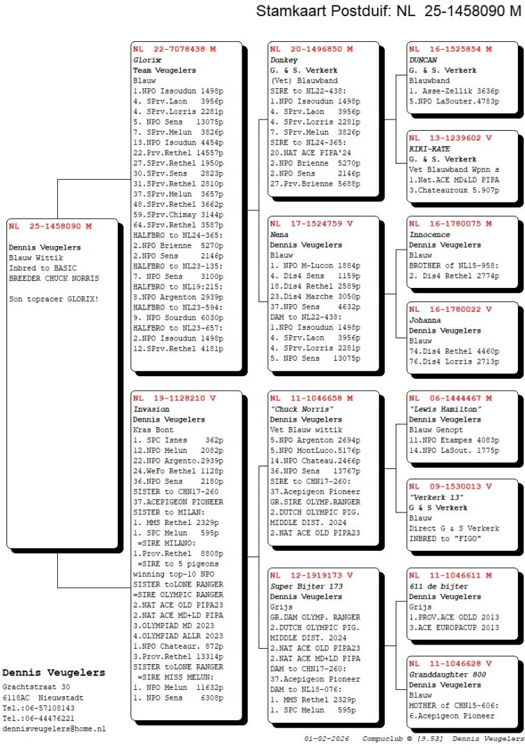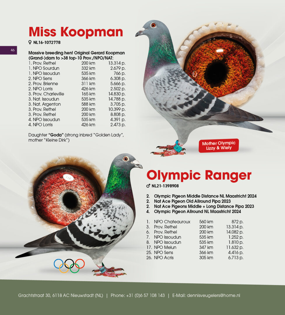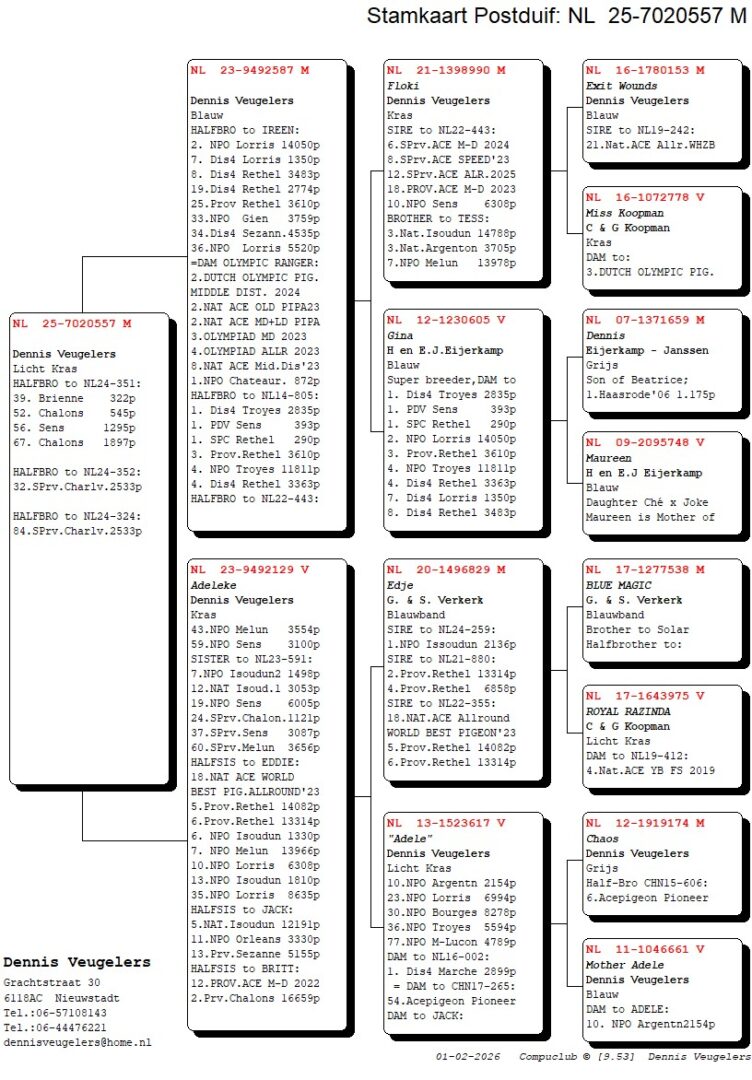 (1/2) broer 32. & 84.-2.533 d., uit: ”De 587”, broer kweker ”Olympic Ranger”, 2. Olympiade duif Cat. Midfond x ”Adeleke”, 43. NPO 3.554 d., 59. NPO 3.100 d., 1/2 zus ”Eddie”, 6x top 13 NPO/Prov., 1/2 zus 1. NPO Issoudun
