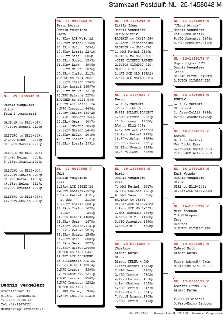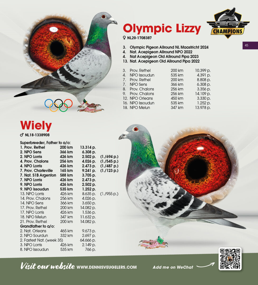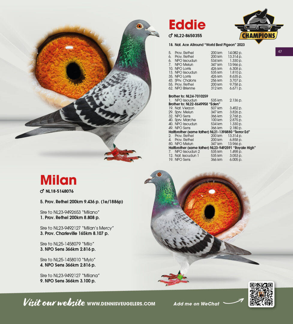 (1/2) broer 32. & 84.-2.533 d., uit: ”De 587”, broer kweker ”Olympic Ranger”, 2. Olympiade duif Cat. Midfond x ”Adeleke”, 43. NPO 3.554 d., 59. NPO 3.100 d., 1/2 zus ”Eddie”, 6x top 13 NPO/Prov., 1/2 zus 1. NPO Issoudun
