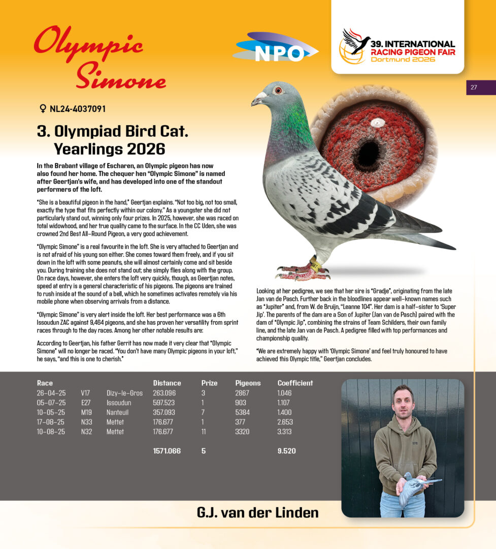 Uit: ”Sam Mace”, 1. Nat. Asduif, 1. Prov. Asduif, 1.-865 d., 1.-821 d., 2.-2.315 d., 2.-1.119 d., 3.-2.290 d. x ”Olympic Simone”, 3. Olympiade duif Cat. JL 2026, 2. Nat. Asduif FCI, 1.-377 d., 3.-2.867 d., 6.-9.464 d., 7.-5.384 d.