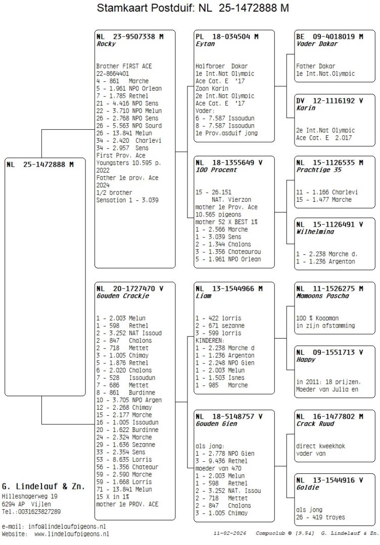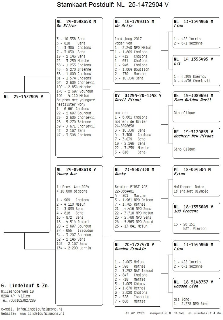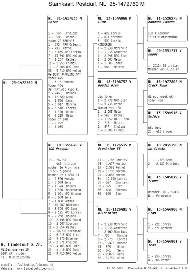 Uit: ”Spike”, 1.-563 d., 3.-598 d., vader 1.-3.181 d., 1.-2.292 d., 1.-1.035 d., 1. NPO 653 d.,  3. Nat. Asduif, 9. Nat. Asduif x ”100 Procent”, 15. Nat. 26.151 d., moeder 1. Prov. Asduif, 1.-3.039 d., 1.-2.566 d., 2.-1.344 d., 3.-1.356 d.