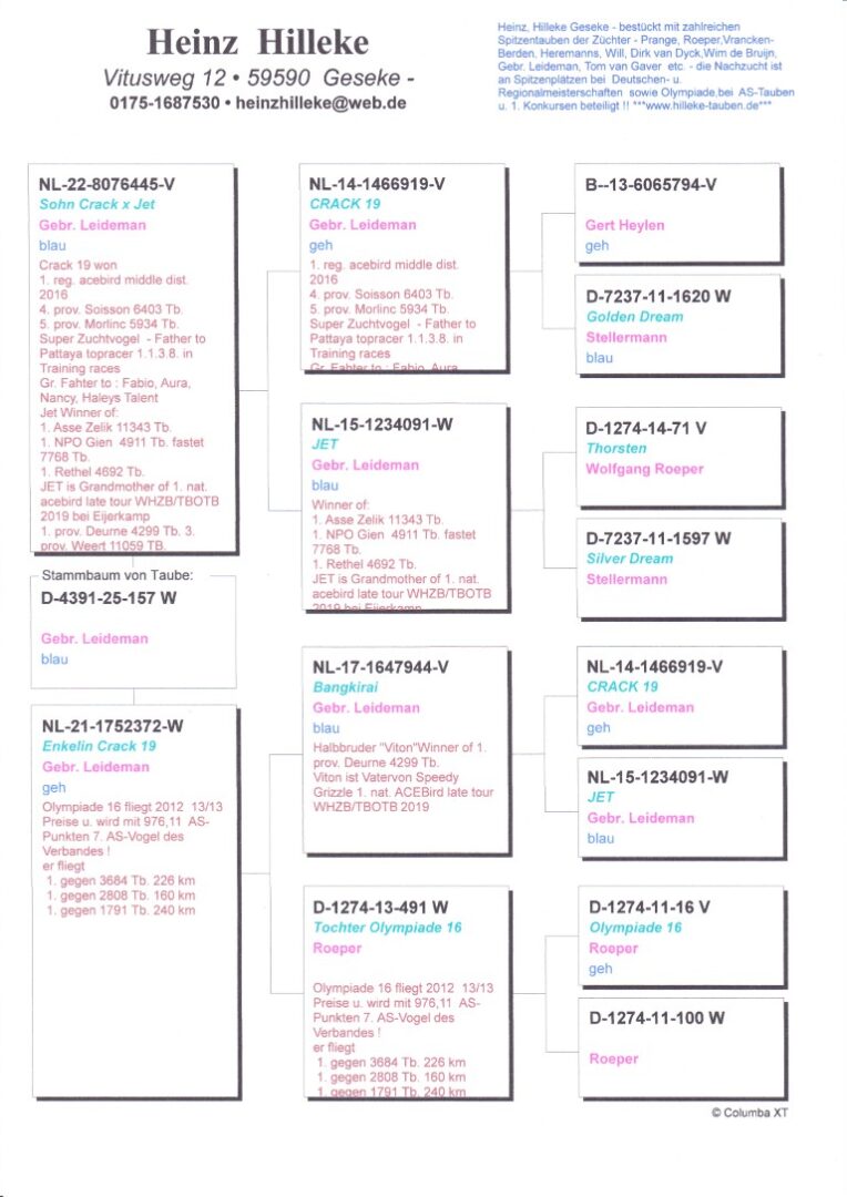 Uit: ”Sohn Crack x Jet”, zoon ”Crack 19”, 1. Regionaal Asduif & Unieke stamvader Leideman, (Gr) vader ”Arturo”, ”Fabio”, ”Cobalt”, etc. x ”Enkelin Crack 19”, uit zoon ”Crack 19” & ”Jet”, 1.-11.343 d., 1.-4.911 d., 1.-4.692 d.