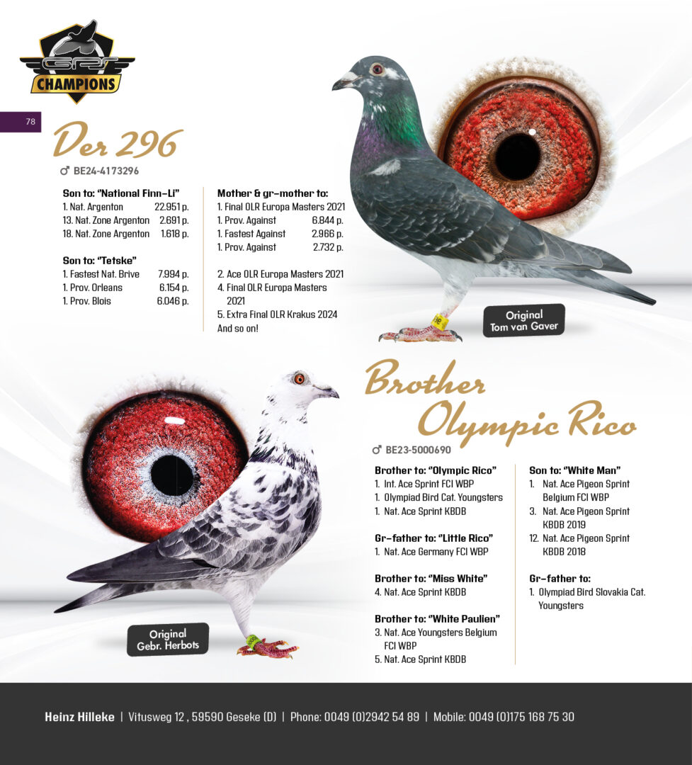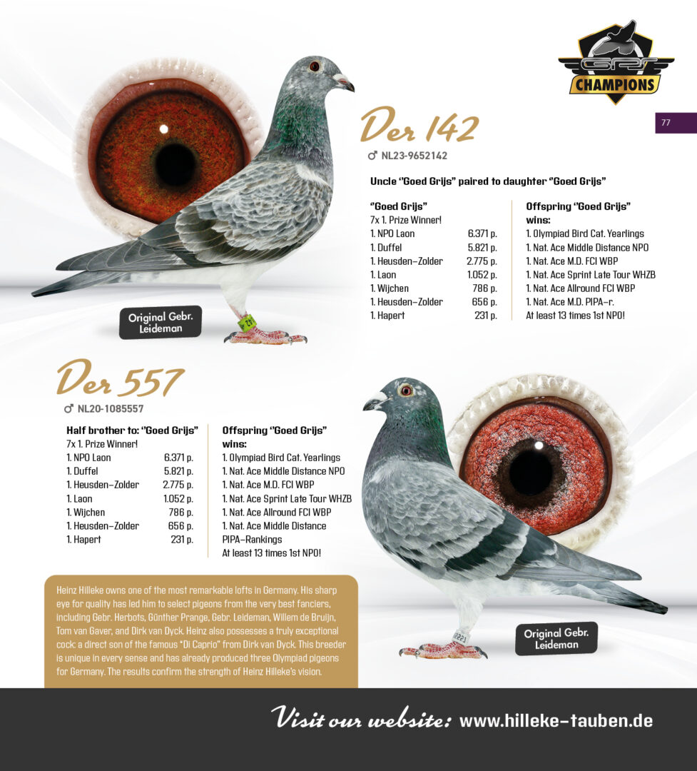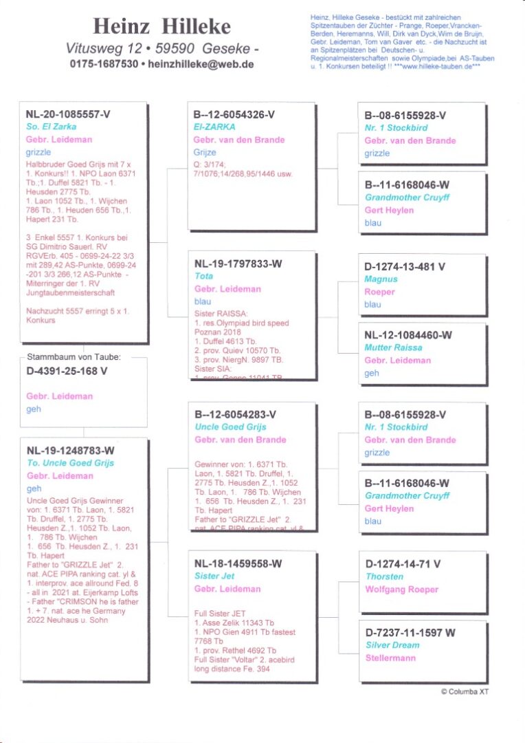 Uit: ”Sohn Uncle Goed Grijs”, zoon ”Oom Goed Grijs”, (Gr) vader 1.-2.-7. Nat. Asduif, uit dochter ”Ace 820” & ”Goed Grijs” x ”To. Bodo x Lea”, uit zoon ”Ace 820” & ”Sia”, uit dochter ”Goed Grijs”, 7x 1. Prijs & 1. NPO Laon