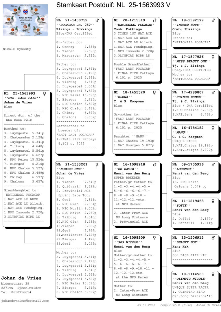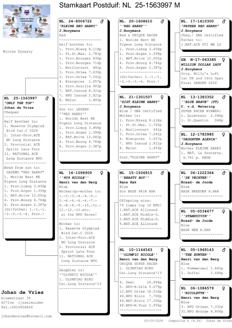 Uit: ”Pogacar Jr. 752”, gr-vader 1.-4.583 d., 1.-2.528 d., 1.-2.235 d. x ”Number One”, 1.-7.540 d., 1.-1.622 d., 2. Prov. Asduif, ouders: 3.-5.341 d., 3.-2.128 d., 4.-5.341 d., 4.-4.640 d., 5.-5.561 d., 5.-6.627 d., 6. NPO 15.526 d., 7.-5.215 d.