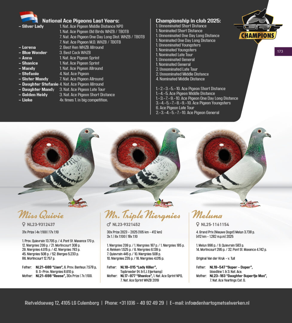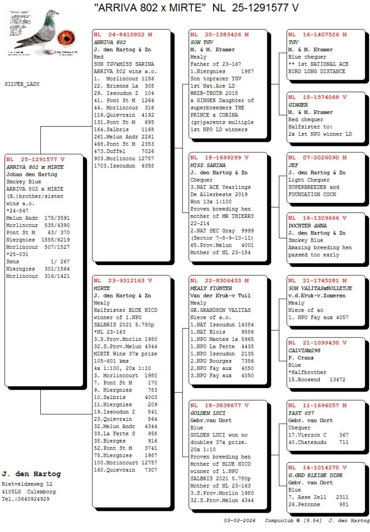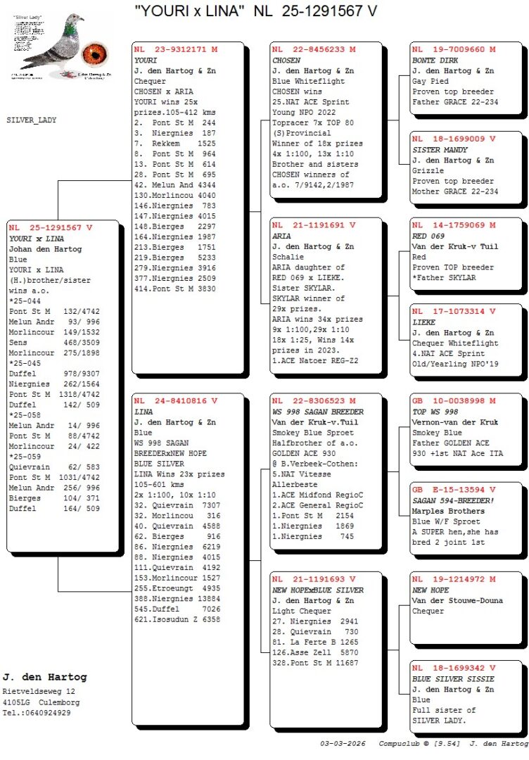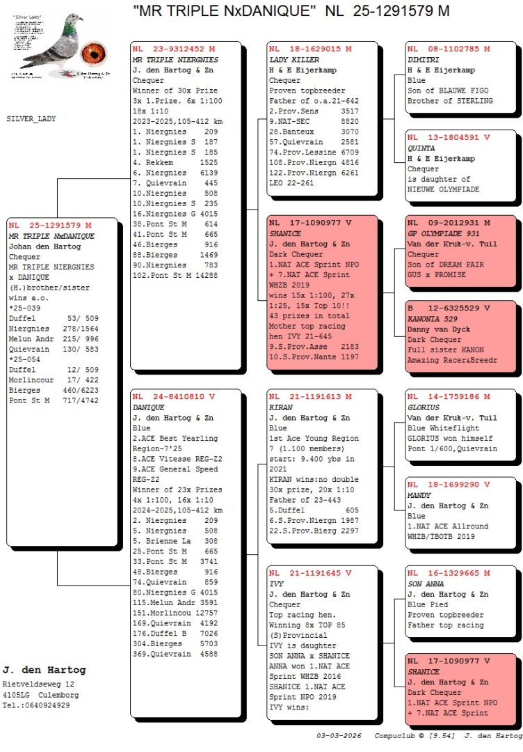 (1/2) broer 12.-509 d., 17.-422 d., 53.-509 d., uit: ”Mr. Triple Niergnies”, 3x 1. Prijs, 1.-209 d., 1.-187 d., 1.-185 d., 4.-1.525 d., 6.-6.139 d., 7.-445 d., 10.-508 d., 10.-235 d. x ”Danique”, 2. Asduif Jaarlingen, 2.-209 d., 5.-508 d.