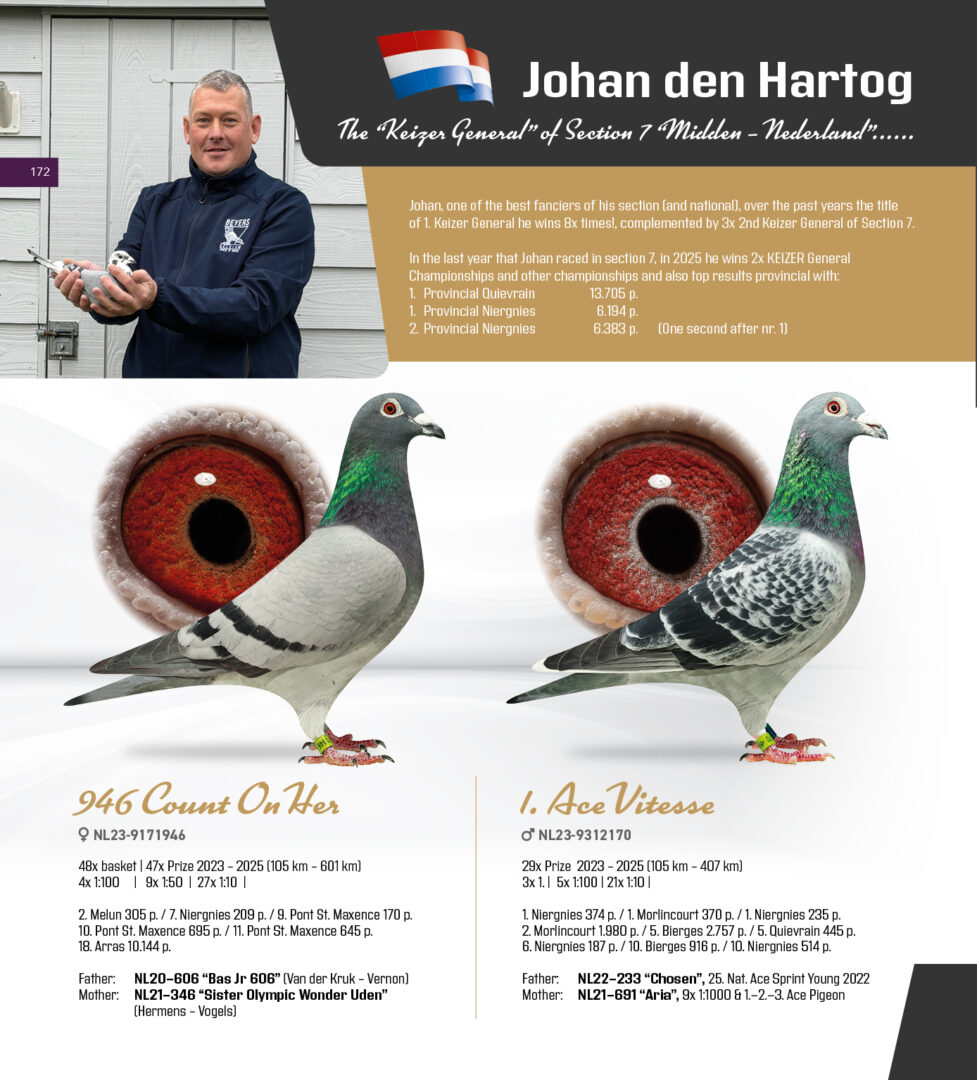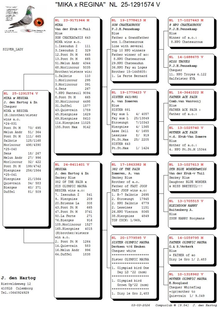 (1/2) zus 18.-267 d., 21.-1.564 d., 27.-996 d., 32.-422 d., 34.-583 d., 51.-364 d., uit: ”Mika”, 1. Issoudun 111 d., 3. Issoudun 329 d., 12.-645 d., 13.665 d. x ”Regina”, 7.-541 d., 9.-209 d., 20.-308 d., 43.-665 d., 47.-3.741 d., 50.-271 d.
