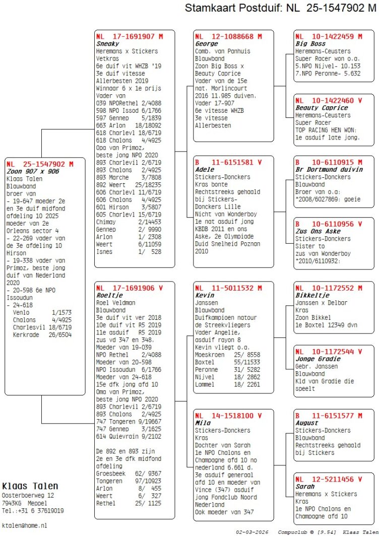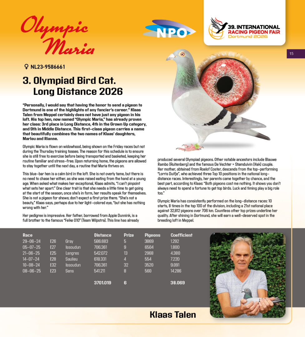 Broer kweker ”Primoz”, 1. Nat. Asduif Jonge Duiven NPO, broer 2. NPO 4.088 d., 6. NPO 1.766 d., uit: ”Sneaky”, 3. Nat. Asduif Vitesse ”Allerbeste”, 6. Nat. Asduif Vitesse WHZB, 1.-2.308 d. & 6x 1. Prijs x ”Roeltje”, Superkweker