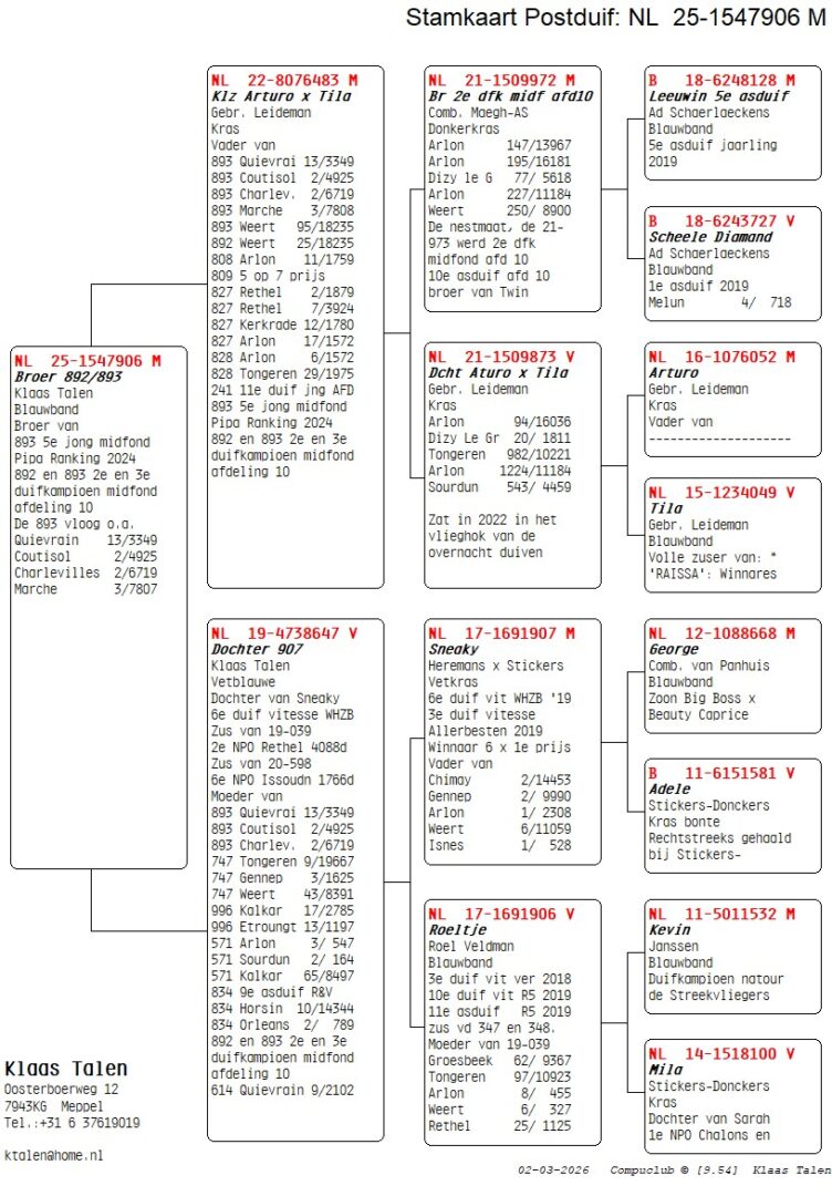 Broer 5. Nat. Asduif Jonge Midfond PIPA, 2. & 3. Prov. Asduif Midfond, 2.-6.719 d., 2.-4.925 d., 2.-1.879 d., 2.-789 d., 3.-7.807 d., 6.-1.572 d., 7.-3.924 d., uit: ”Klz. Arturo x Tila”, Gebr. Leideman x ”Dochter 907”