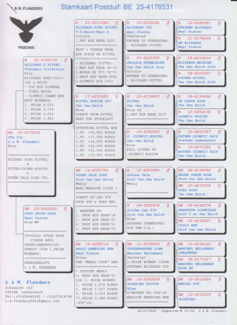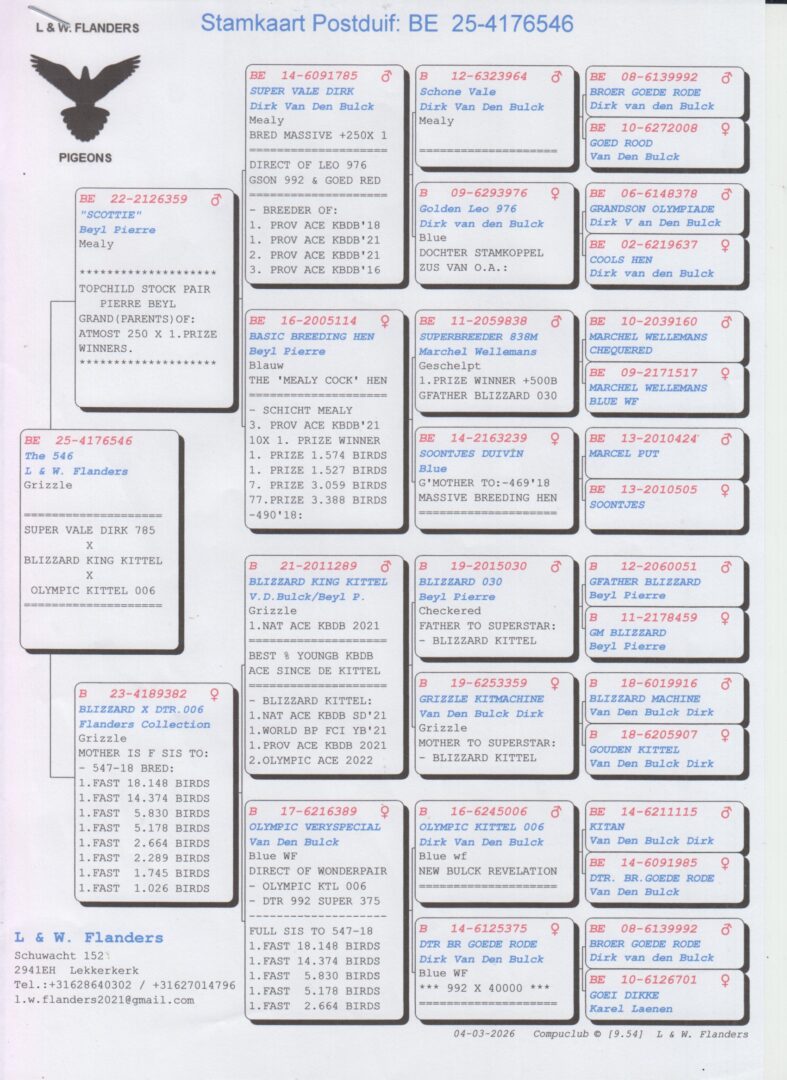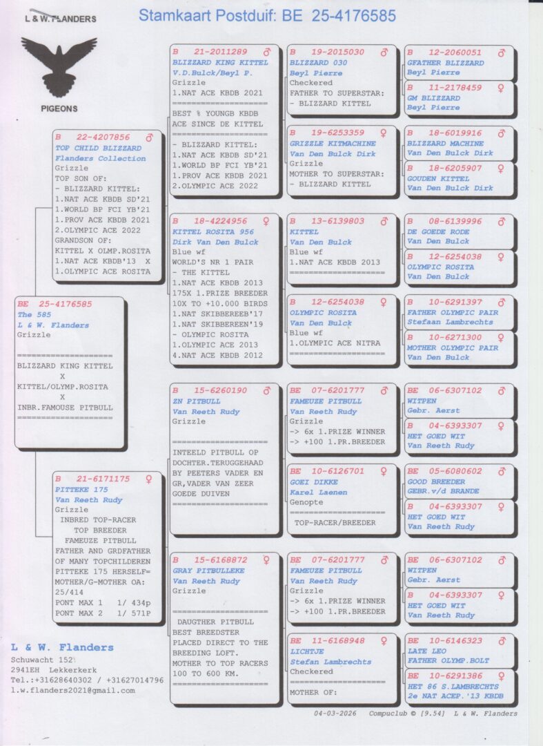 Uit: ”Scottie”, zoon Superkoppel (Gr) ouders 150x 1. Prijs x ”Blizzard x Dtr. 006”, dtr. ”Blizzard King Kittel”, 1. Nat. Asduif KBDB & vader ”Unicum Blizzard”, 1. Nat. Asduif KBDB, uit broer ”Phantom Blizzard”, 1. Nat. Asduif