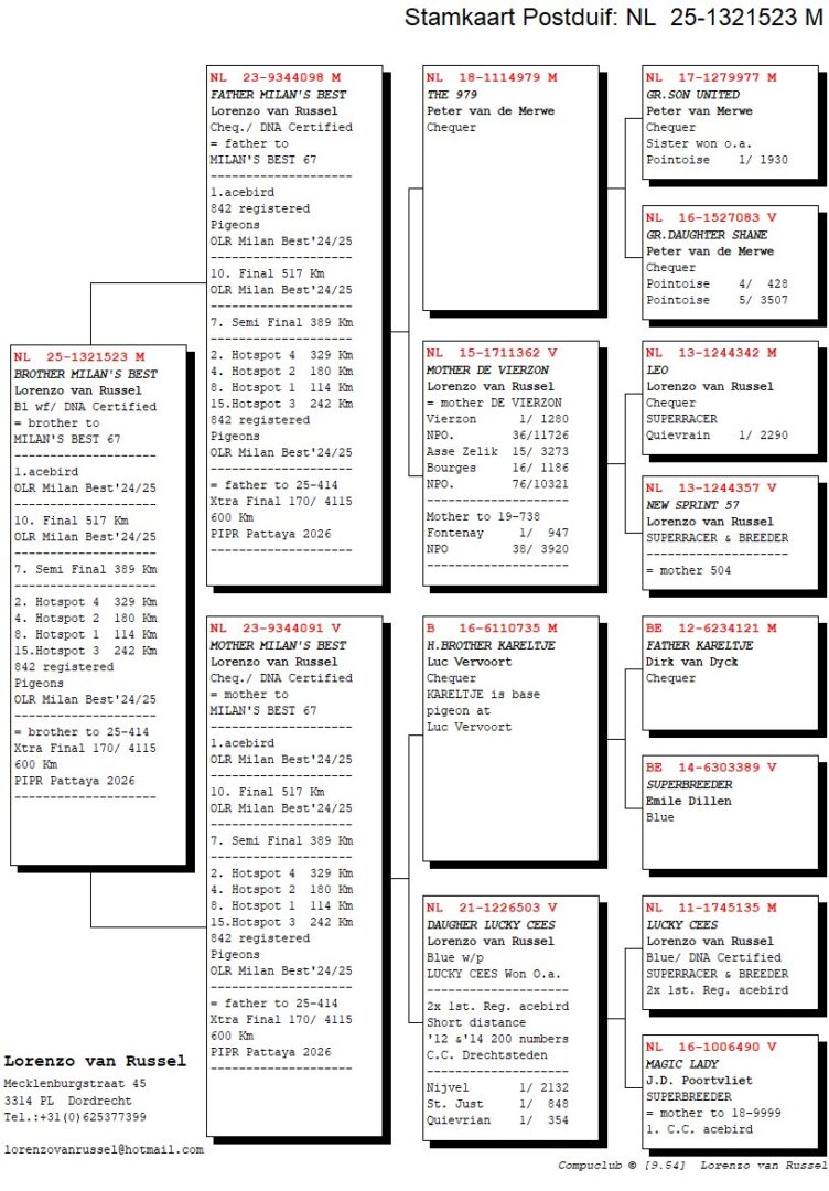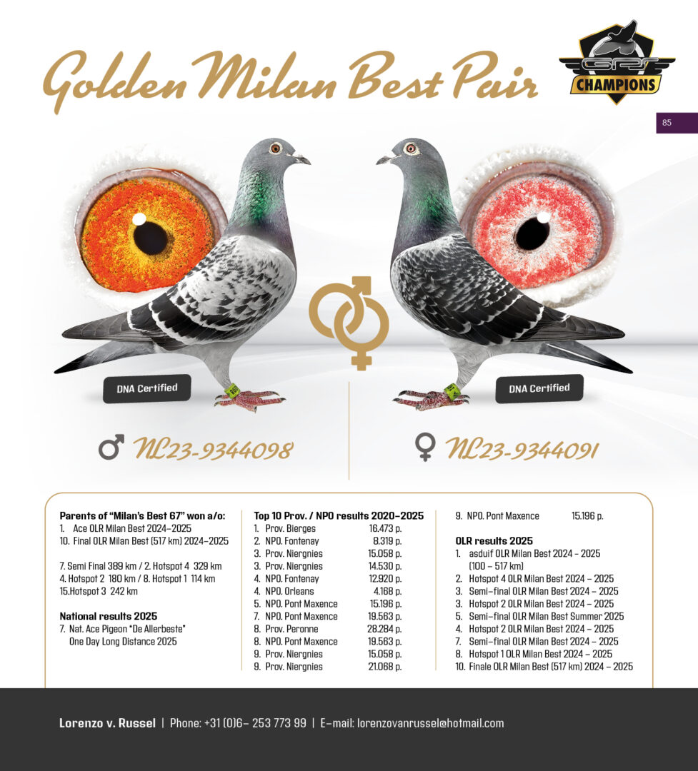 Broer ”Milan’s Best 67”, 1. Asduif OLR Milan Best, 2.-4.-8.-15. Hotspot winnaar, 7. Halve Finale & 10. Finale OLR Milan Best, uit: ”Father Milan’s Best”, 50% v/d Merwe x ”Mother Milan’s Best”, 50% Luc Vervoort, uit 1/2 broer ”Kareltje”