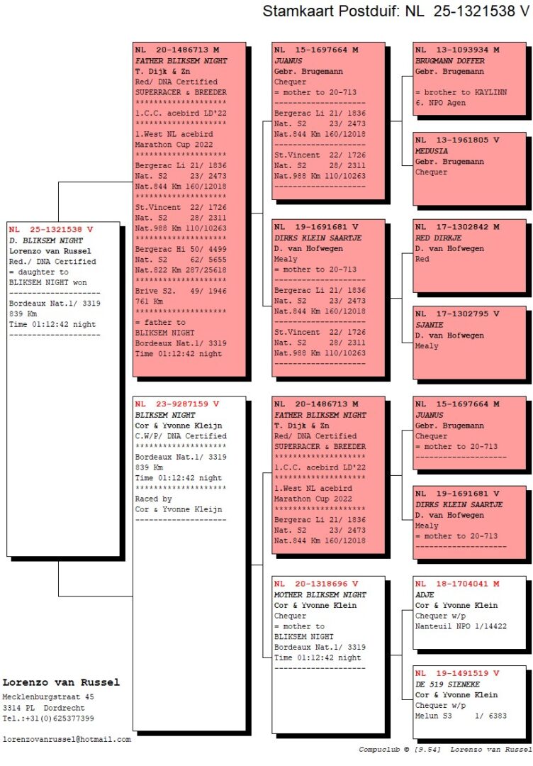 Uit: ”Father Bliksem Night”, 1. West NL Asduif Marathon Cup, 23. & 62. Nat. Bergerac, 28. Nat. St.Vincent, 49. Nat. Brive, vader ”Bliksem Night”, 1. Nat. Bordeaux 3.319 d. x ”Bliksem Night”, 1. Nat. Bordeaux 3.319 d. (Geklokt 01.12)