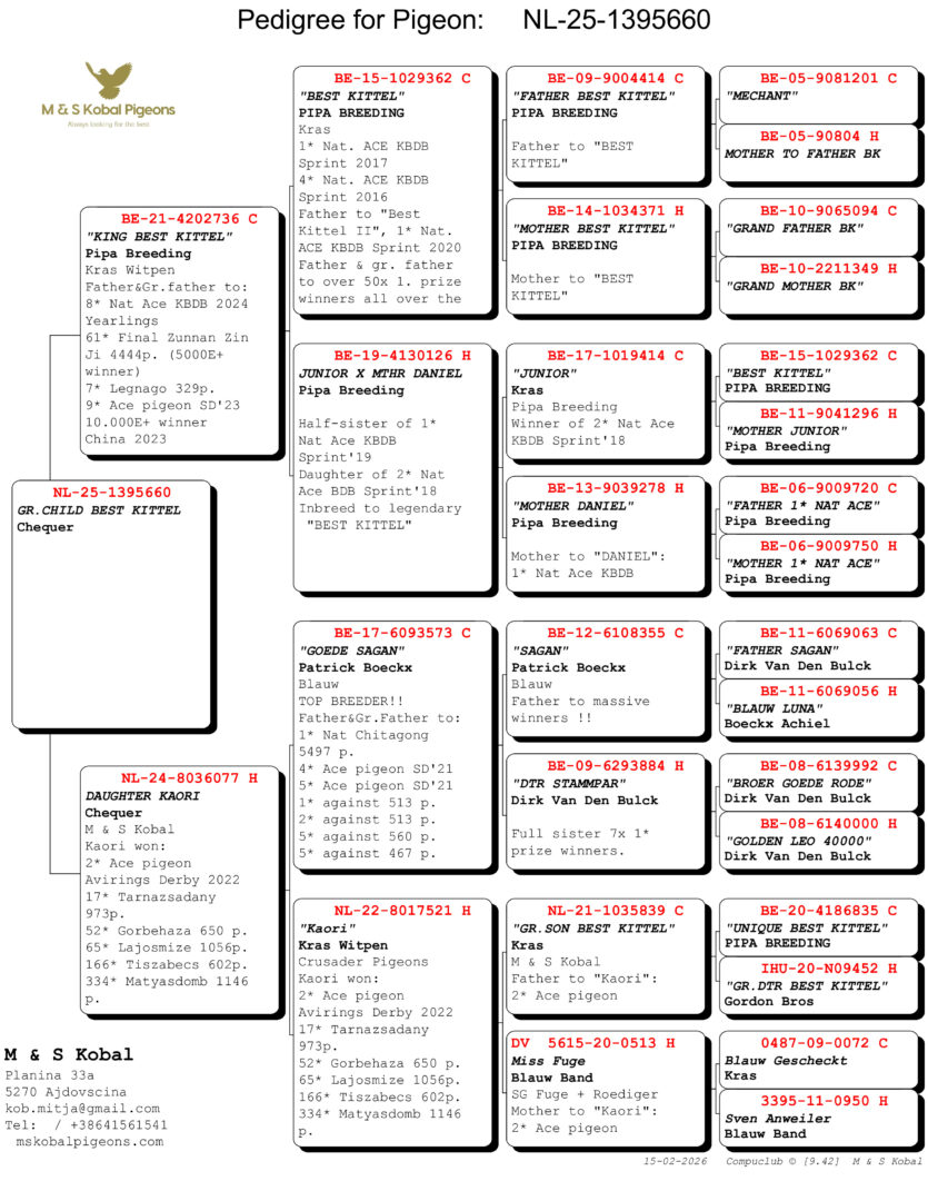 Uit: ”King Best Kittel”, (Gr) vader 8. Nat. Asduif KBDB, zoon ”Best Kittel”, 1. & 4. Nat. Asduif Sprint KBDB x ”Daughter Kaori”, dochter ”Kaori”, 2. Asduif OLR Avirings, uit zoon ”Sagan”, 1. Nat. Asduif Sprint KBDB