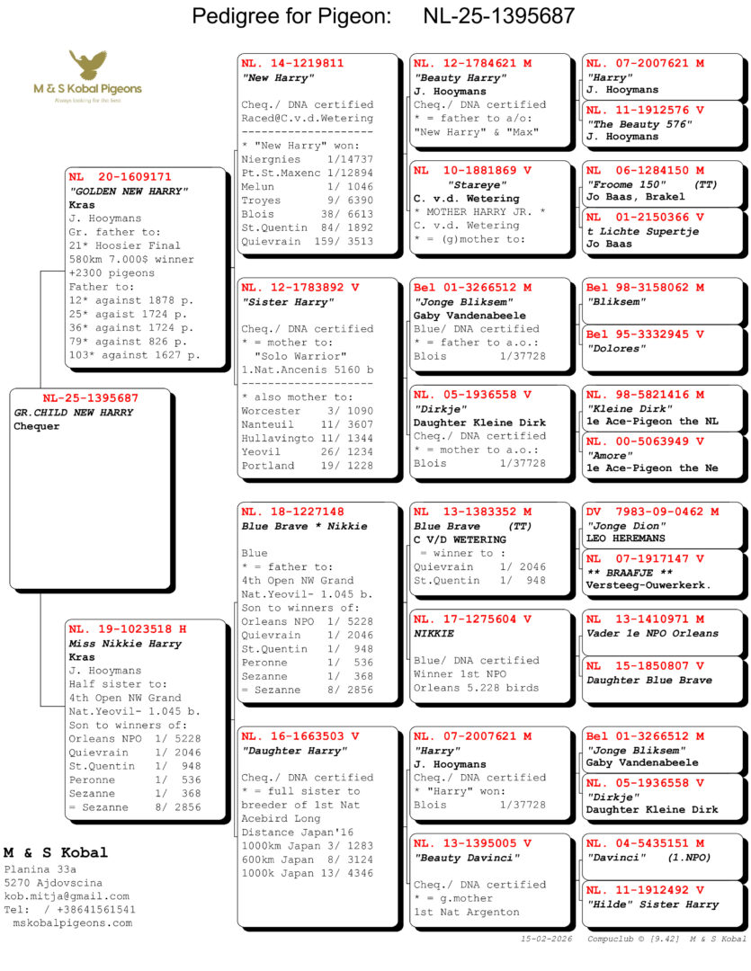 Uit: ”Golden New Harry”, (Gr) vader 21. Finale OLR Hoosier, zoon ”New Harry”, gr-vader ”Olympic Jan”, ”Corrie” & ”Olympic Suze” x ”Miss Nikkie Harry”, 1/2 zus 4. Nat. 1.045 d., uit dochter ”Harry”, uit zoon ”Blue Brave”