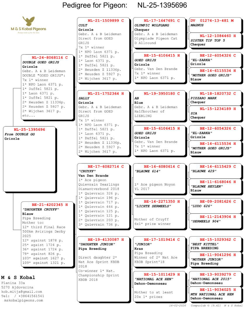(1/2) broer 12. Finale OLR Avirings 2025, uit: ”Double Goed Grijs”, uit zoon & dochter ”Goed Grijs”, 7x 1. Prijs & 1. NPO Laon 6.371 d., nazaten 7x 1. Nat. Asduif x ”Dtr. Cruyff”, dtr. ”Cruyff”, 1. Asduif Quiévrain Diamantverbond
