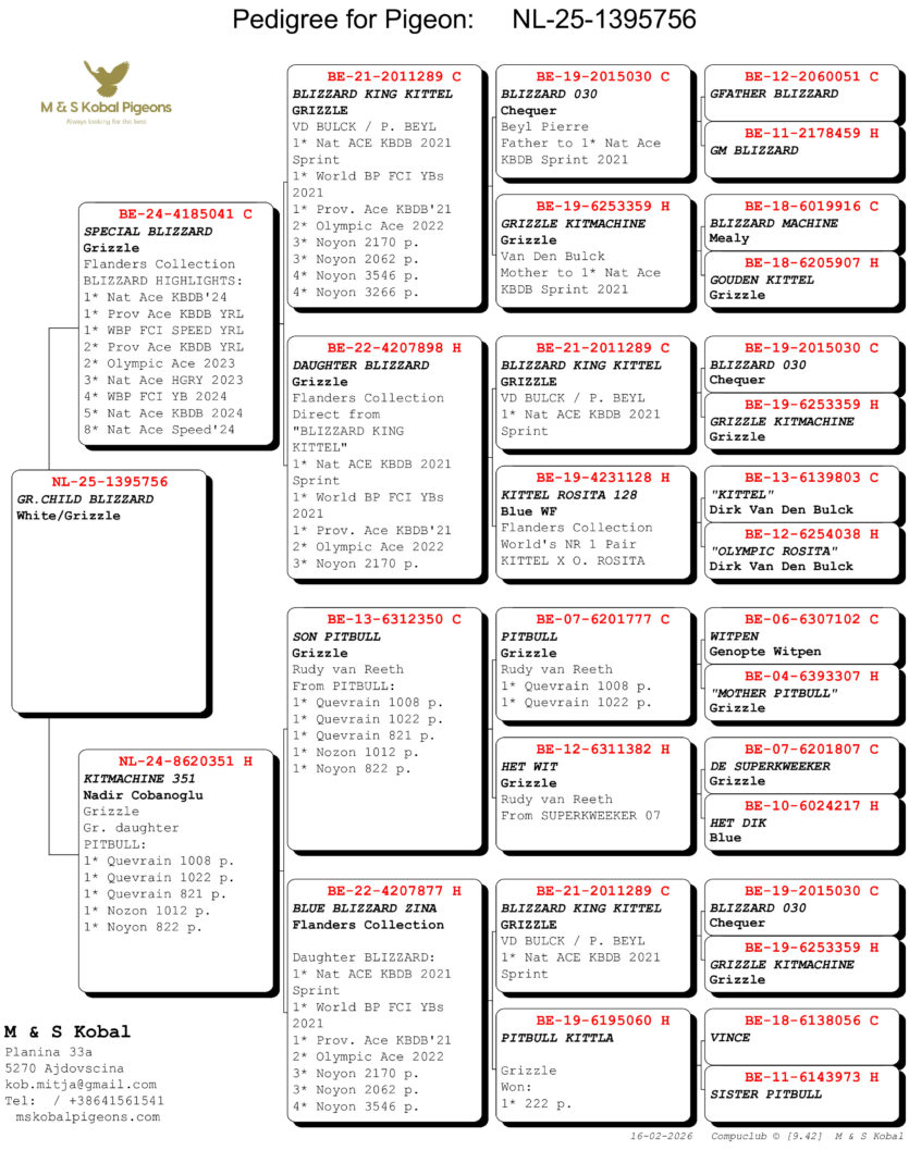 Uit: ”Special Blizzard”, inteelt zoon ”Blizzard King Kittel”, 1. Nat. Asduif KBDB & vader ”Unicum Blizzard”, 1. Nat. Asduif KBDB x ”Kittelmachine 351”, uit dochter ”Blizzard King Kittel”, uit zoon ”Pitbull”, Rudy van Reeth