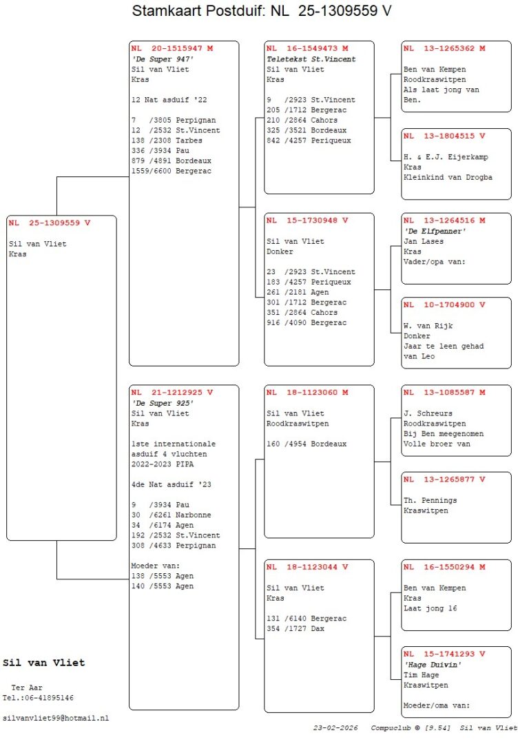 Uit: ”De Super 947”, 12. Nat. Asduif Int. Vluchten, 7. Nat. Perpignan 3.805 d., 12. Nat. St.Vincent 2.532 d. x ”De Super 925”, 1. Int. Asduif Int. Vluchten 22/23, 4. Nat. Asduif Int. Vluchten, 9. Nat. Pau, 30. Nat. Narbonne, 34. Nat. Agen