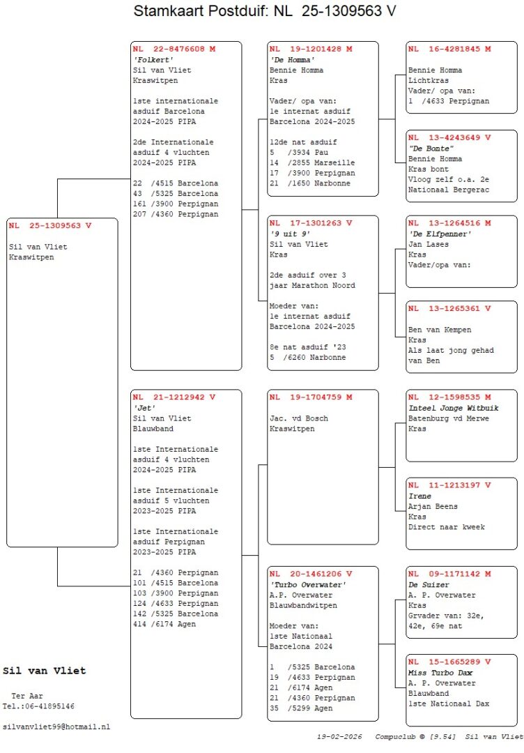 Broer ”Folkert”, 1. Int. Asduif Barcelona 24/25, 22. & 43. Nat. Barcelona uit: ”De Homma”, (Gr) vader 5. Nat. Pau, 12. Nat. Asduif, 14. Nat. Marseille, 17. Nat. Perpignan x ”9 uit 9”, 2. Prov. Asduif 3 Jaar, moeder 5. Nat. Narbonne