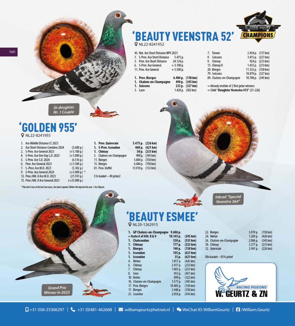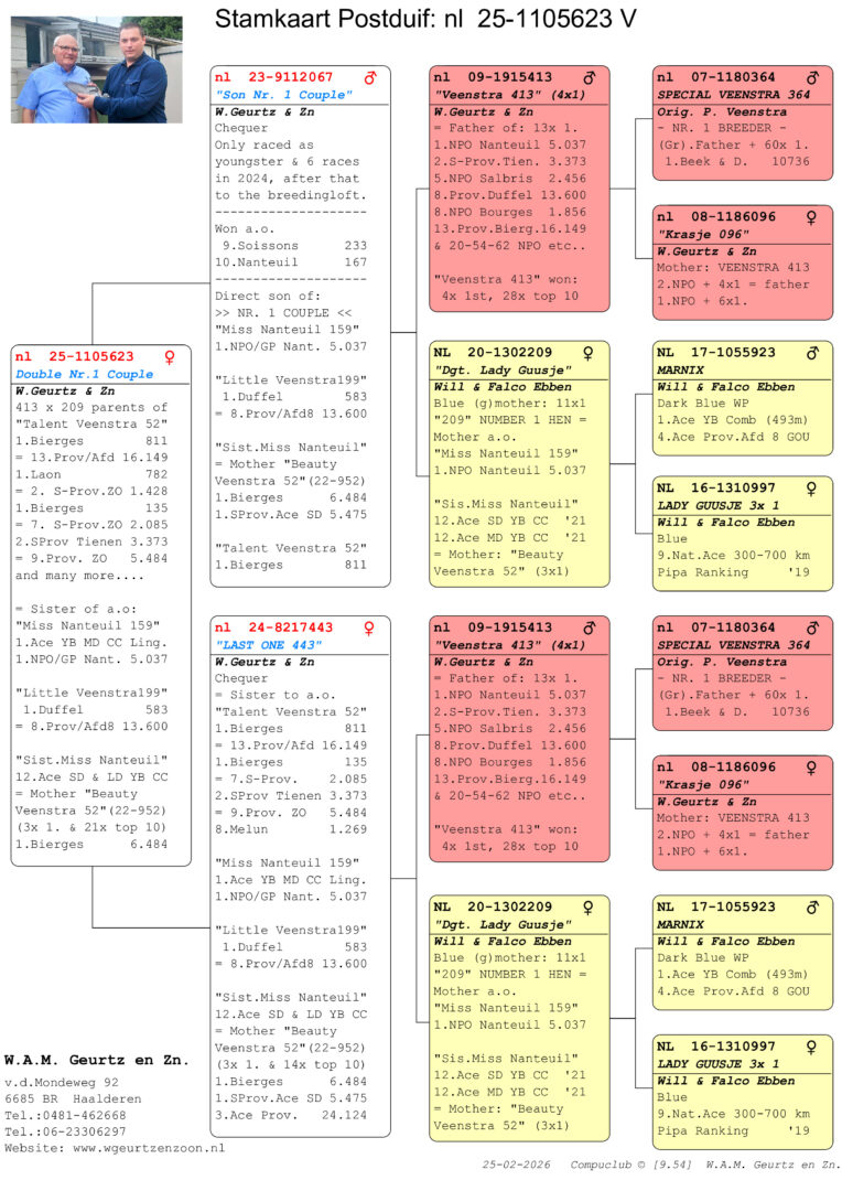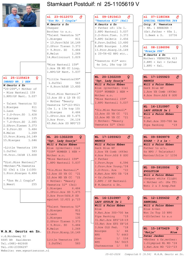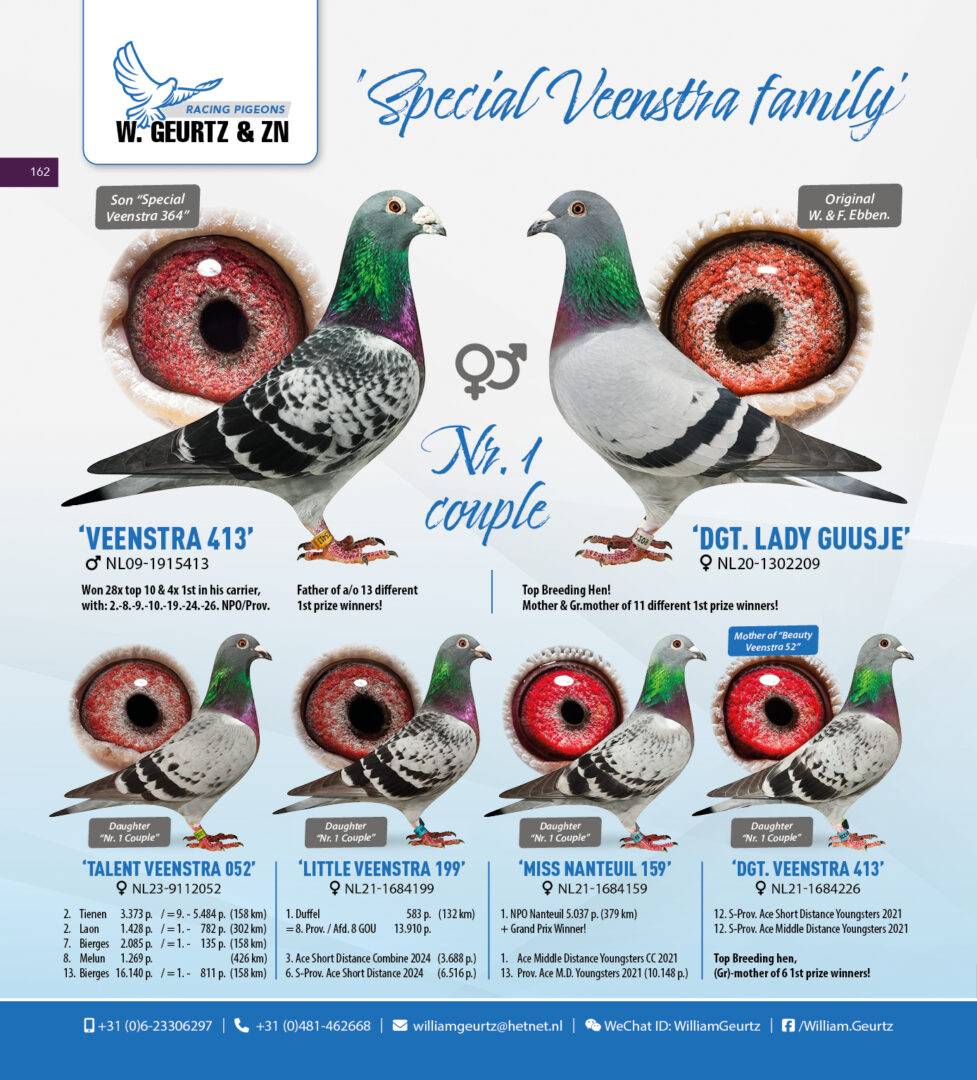 (1/2) broer 1. NPO Grand Prix Nanteuil 5.037 d., 1.-811 d., 1.-782 d., 1.-583 d., 2.-3.373 d., 7.-2.085 d., 8.-1.269 d., uit: ”Son Nr. 1 Couple”, zoon ”Veenstra 413” & ”Dgt. Lady Guusje” x ”Dgt. Lady Guusje”, Nummer 1 kweekduivin