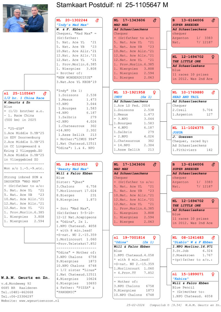 (1/2) broer 1. Race China (500 km) 2025, 1. Asduif Jonge Duiven Midfond EDV, 2. Asduif Jonge Duiven Midfond CC, uit: ”Indy’s Mad Max”, W. & F. Ebben, zoon ”Mad Max” & ”Indy” x ”Beauty Mad Max”, dtr. ”Mad Max” & ”Odina”