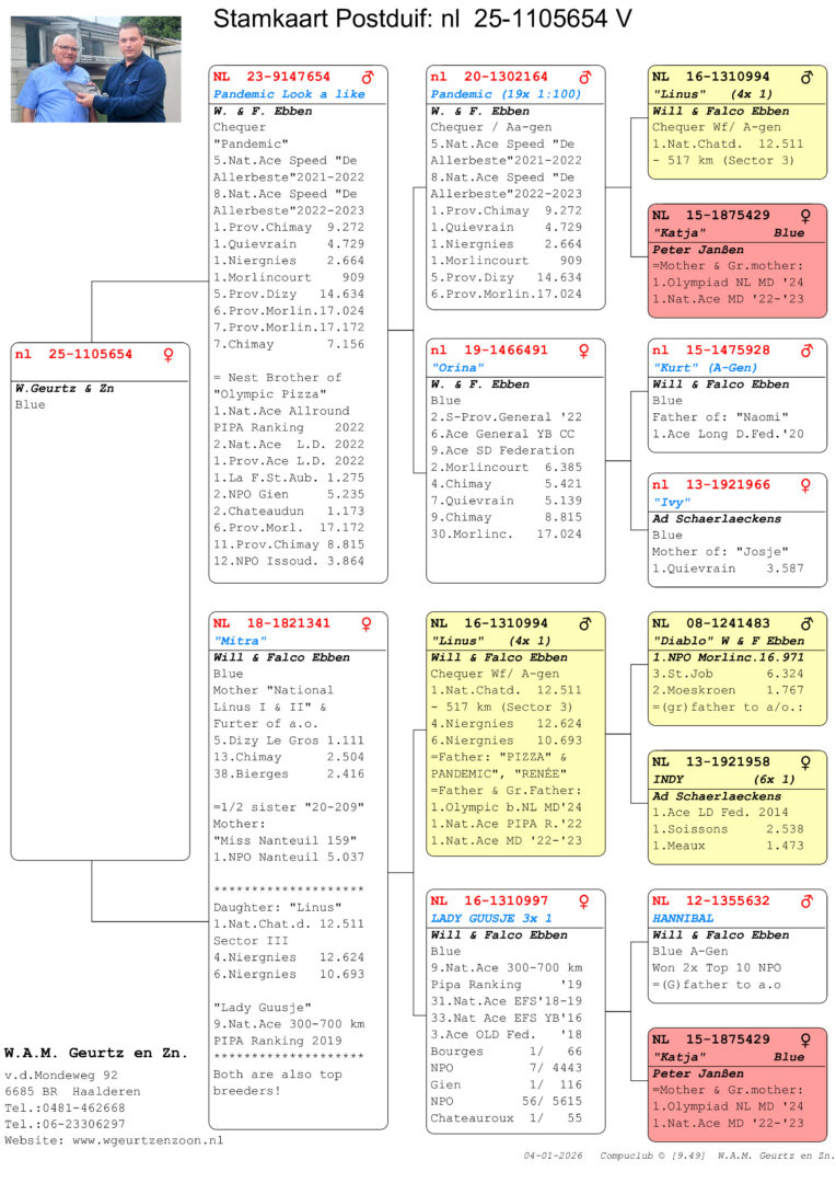(1/2) zus: “National Linus I”, uit: ”Pandemic Look a Like”, zoon ”Pandamic”, 5. & 8. Nat. Asd., 1. Prov. 9.272 d., 1.-4.729 d., 1.-2.664 d., 1.-909 d., & broer ”Olympic Pizza”, 1. Olympiade duif x ”Mitra”, dtr. ”Linus”