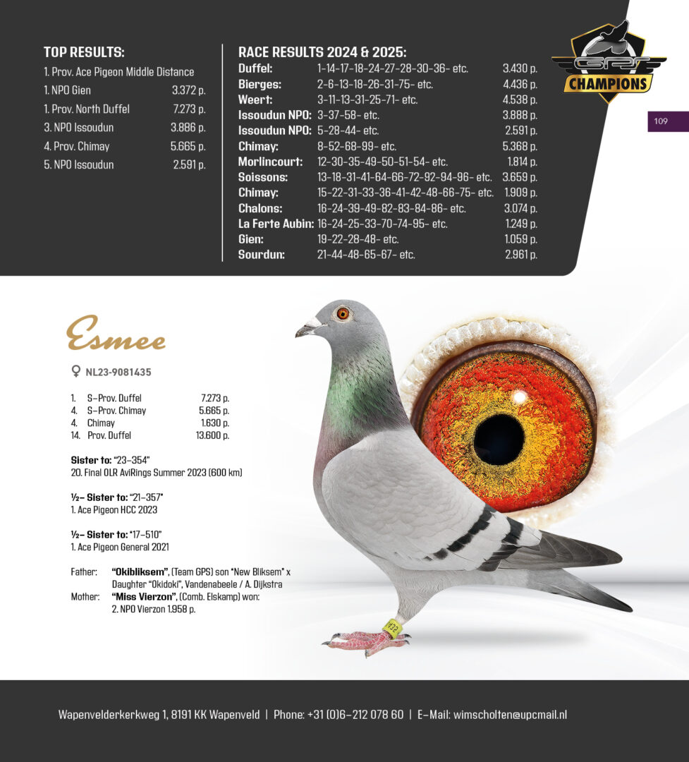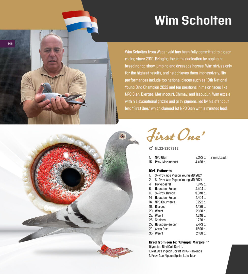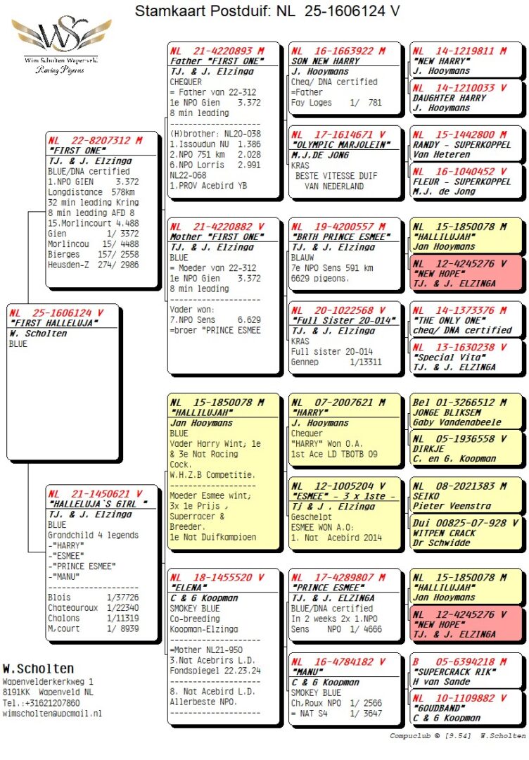 Uit: ”First One”, 1. NPO Gien 3.372 d. (8 min. vooruit), uit zoon ”Olympic Marjolein” x ”Halleluja’s Girl”, dtr. ”Elena”, mdr. 3. & 8. Nat. Asduif, gr-mdr. 1. Finale OLR Pattaya, kld. ”Harry”, ”Esmee”, ”Prince Esmee” & ”Manu”