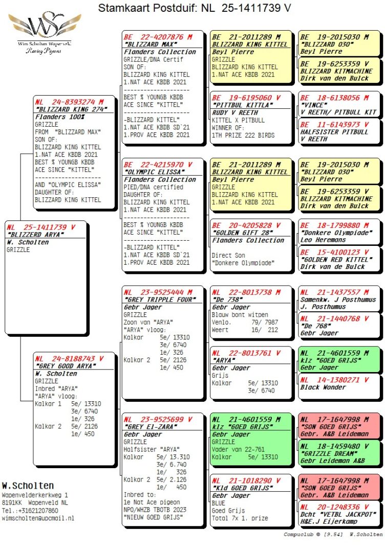 Uit: ”Blizzard King 274”, uit zoon & dochter ”Blizzard King Kittel”, 1. Nat. Asduif KBDB & vdr. ”Unicum Blizzard”, 1. Nat. Asduif KBDB x ”Grey Good Arya”, 4x inteelt ”Goed Grijs”, 7x 1. Prijs & 1. NPO Laon, nazaten: 7x 1. Nat. Asduif