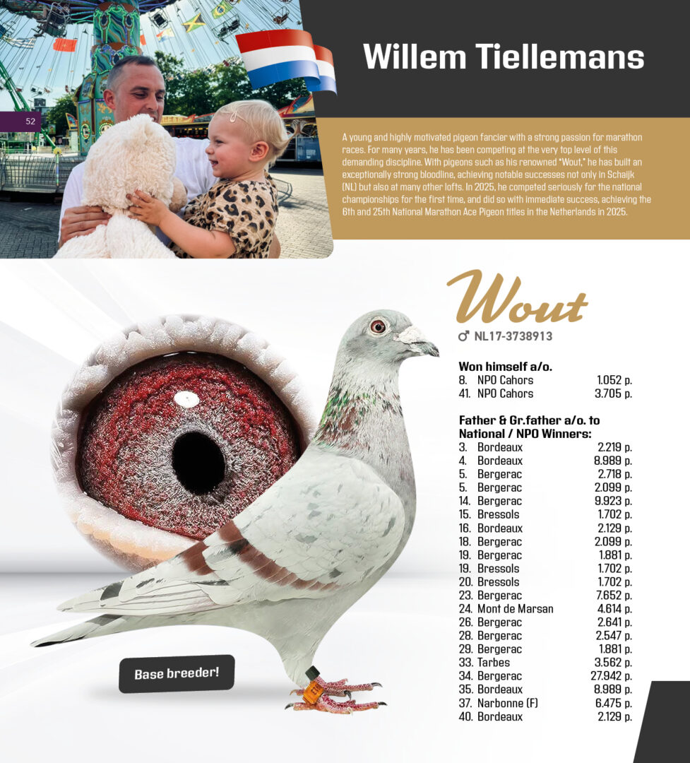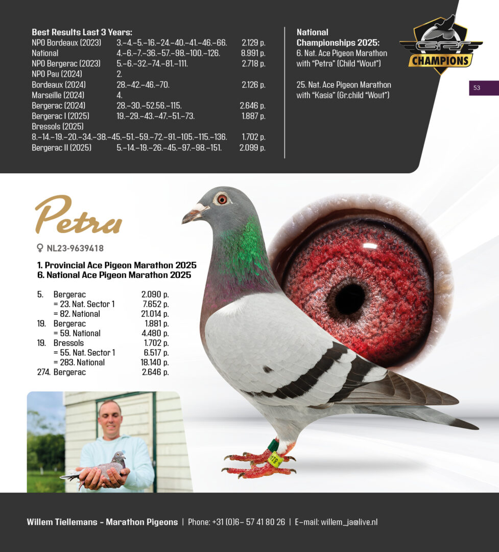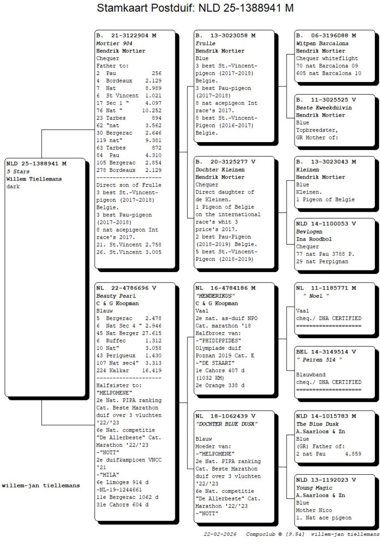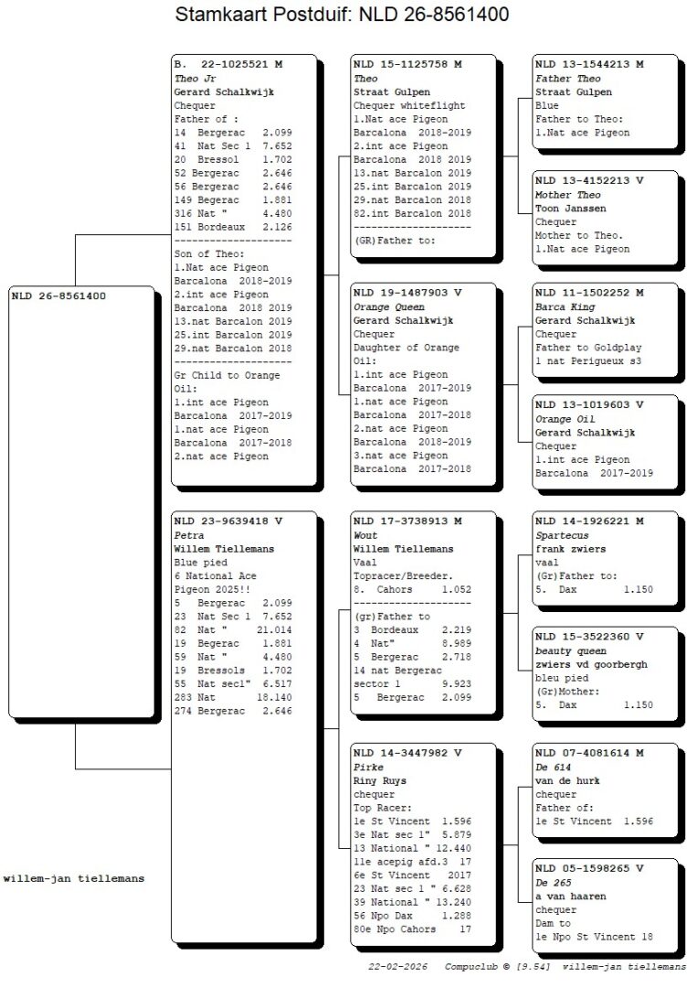 Uit: ”Theo Jr.”, vader 14. NPO Bergerac 2.099 d., 20. NPO Bressols 1.702 d., zoon ”Theo”, 1. Nat. Asduif Barcelona x ”Petra”, 6. Nat. Asduif Marathon NPO 2025, 5. NPO Bergerac 2.099 d., 19. NPO Bergerac 1.881 d., 19. NPO Bressols