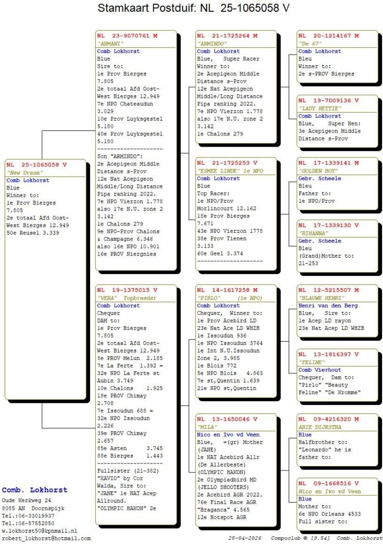Achter deze prestatie schuilt bovendien een sterke en interessante afstamming. De moeder van “New Dream” is een volle zus van de sensatie “Xavio” van Cor Walda. Deze “Xavio” bewees al op jonge leeftijd zijn uitzonderlijke kweekwaarde als vader van onder andere: