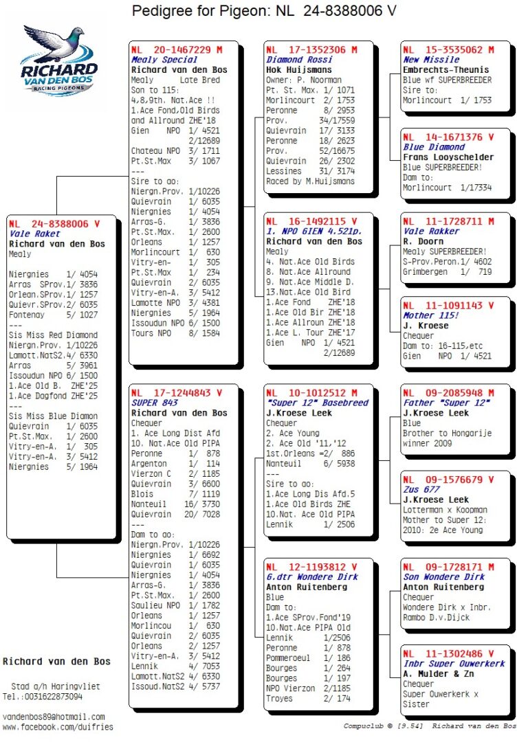 Blikvanger van deze prestatie was opnieuw zijn topduivin “Vale Raket”, die haar klasse nogmaals bevestigde. Deze uitzonderlijke duivin bouwt verder aan een indrukwekkende erelijst, met onder andere: