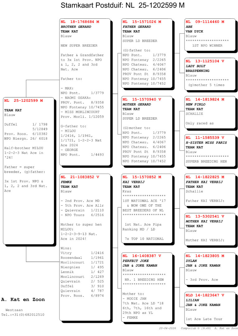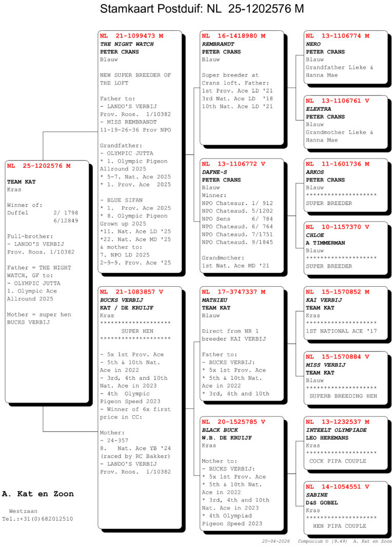 De afgelopen jaren wist Team Kat zich al nadrukkelijk op de kaart te zetten met absolute topprestaties. Vorig seizoen maakten zij indruk met hun topduif “Olympic Jutta”, die werd gekroond tot 1e Olympiadeduif Allround. Het jaar daarvoor behaalden zij eveneens een toptitel met “Milou”, goed voor 1e Nationaal Asduif.
