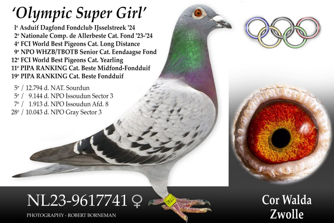 Tot slot laat ik graag Cor aan het woord “Olympic Super Girl is een geweldige atleet en dit zeker op de vluchten van 500 tot 700 km, gewoon een geweldige fijne duivin. In 2024 ging het werkelijk super en ook dit jaar was het op de eerste dagfondvlucht gelijk weer raak met de 3e Gien van 2.770 duiven en was de buit binnen. Gelukkig dachten de mannen van GPS mee en zij zeiden dat de kans groot was dat zij een Olympiade duif zou kunnen worden. Hun advies was; houd ze thuis. Na enige twijfel van mijn kant heb ik dit ook gedaan. Ik wil GPS nogmaals danken voor deze wijze raad”.