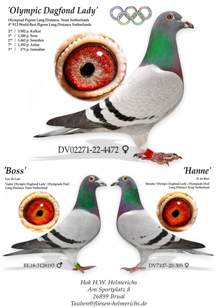 De Olympiade kwaliteiten zat al in het bloed van dit duivinnetje. Haar moeder ‘Hanne’, vernoemd vanwege haar schoonheid naar Winfried zijn vrouw is kleindochter van ‘Olympic Blue’. Een Olympiade winnares in Poznan. Hanne werd verkregen van vriend Dirk de Beer. De vader van Dagfond Lady heet ‘Boss’. Vanwege zijn sterke karakter en is al een echte stamvader. Hij komt rechtstreeks uit het stamkoppel van Luc de Laer.