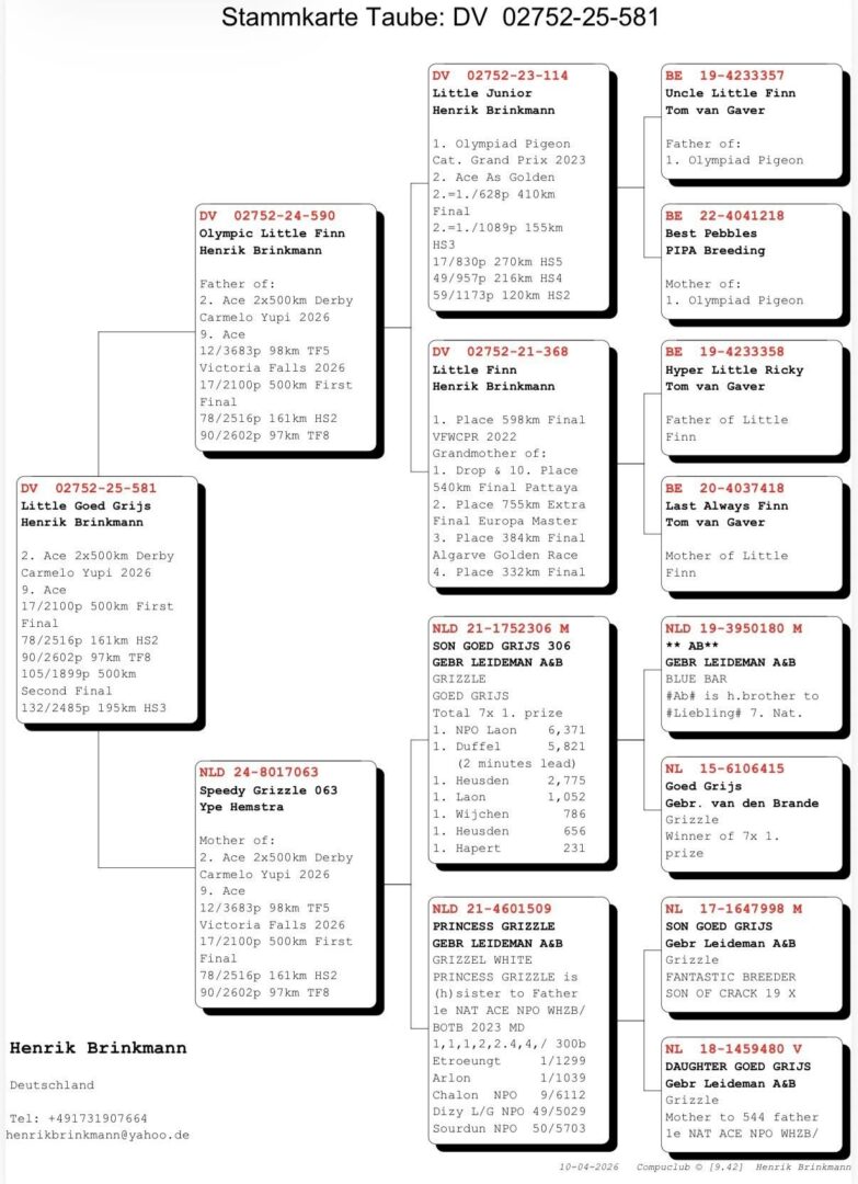 De moeder van deze duif werd gekweekt door Ype Hemstra. Zij is een dochter van “Son Goed Grijs 998”, de beste kweekzoon van de legendarische “Goed Grijs”. Deze duif is het resultaat van een sterke inteelt naar de beroemde “Goed Grijs”-lijn.