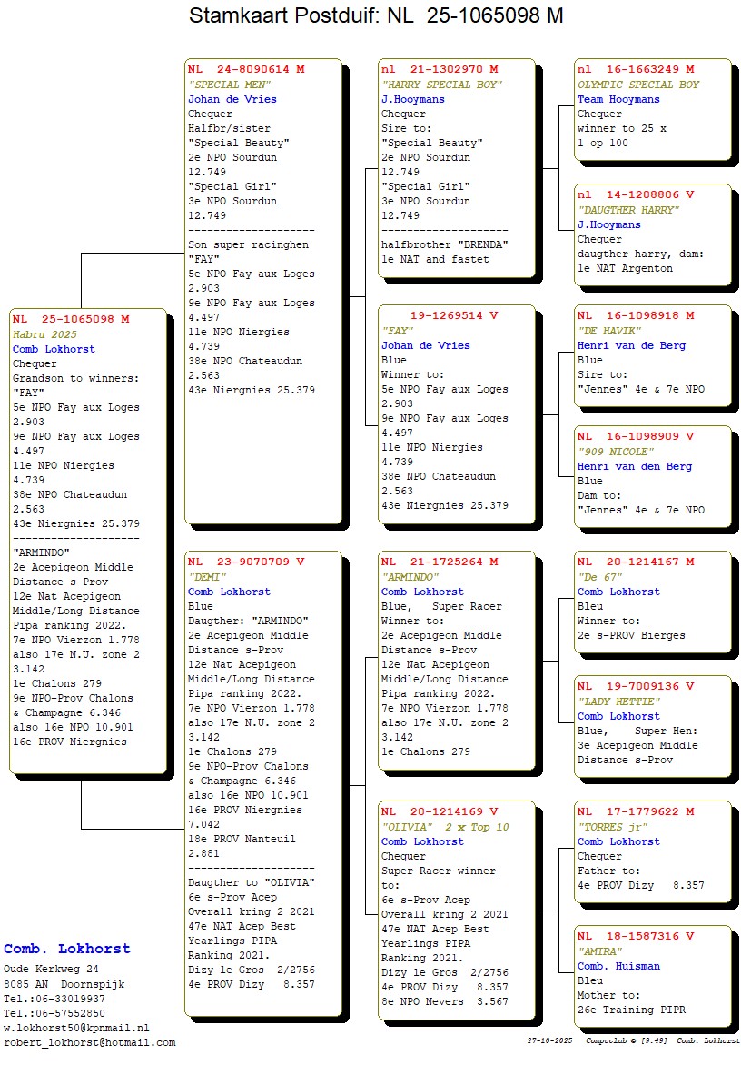 Bon 20: Comb. Lokhorst. NL) schenkt jonge duif 2025 (zie pedigree) uit ‘Special Men’ x ‘Demi’