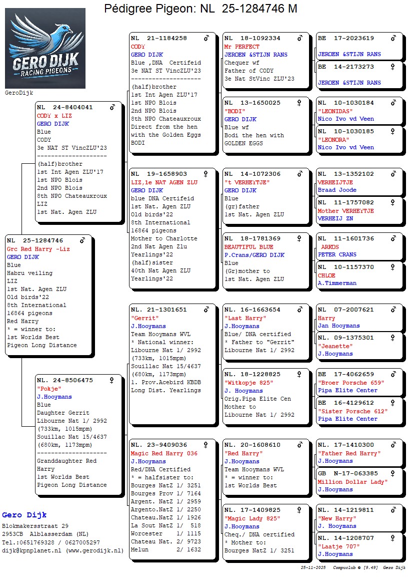 Bon 33: Gero & Evelien Dijk. (NL) schenken jonge duif 2025 (zie pedigree) – kleinkind van twee 1e Nationaal winnaars