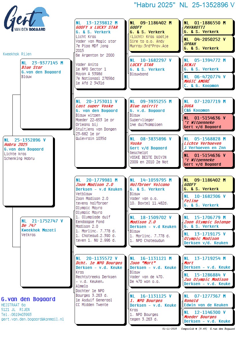Bon 35: Gert van den Bogaard. (NL) schenkt jonge duif 2025 (zie pedigree) uit beste van Verkerk x Derksen-VD Keuken